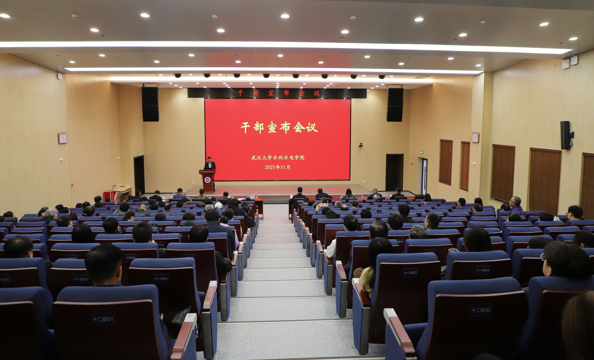 11月12日下午,学院召开新一届行政领导班子任职宣布大会。武汉大学党委常务副书记沈壮海、党委组织部副部长谌启航出席会议,学院全体教职工参加会议。学院党委书记、水资源工程与调度全国重点实验室主任李典庆主持。党委组织部副部长谌启航宣读学校文件会上,谌启航代表学校党委宣读了关于水利水电学院新一届行政领导班子任职的决定,刘攀任水利水电学院院长,伍靖伟、夏军强、杜文琪、马刚任副院长。刘攀代表新一届行政领导班子发言刘攀代表新一届行政领导班子发言。... >>