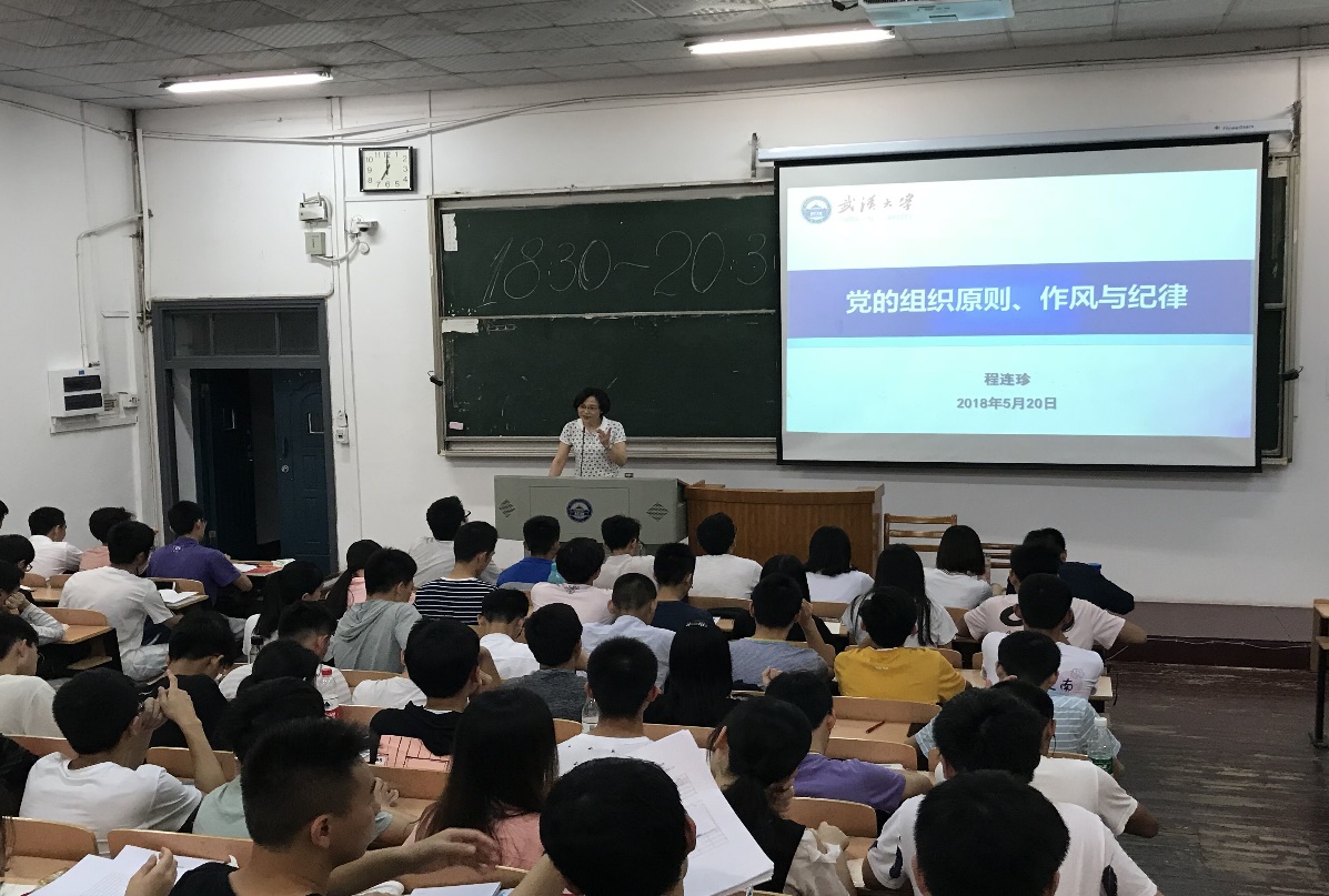 2018年5月20日晚,水利水电学院党委书记、第九分党校校长程连珍为第九分党校第61期入党积极分子培训班全体培训学员讲授《党的组织原则、作风和纪律》。