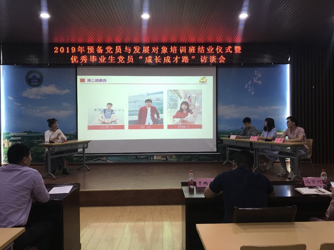 结业仪式结束后,2019年优秀毕业生党员“成长成才路”访谈会正式开始。访谈会首先以视频的形式为我们展示了各位优秀毕业生党员大学生活中的点点滴滴,在学术科研、学生工作、文体竞赛、社会实践等多个方面都有他们活跃的身影。