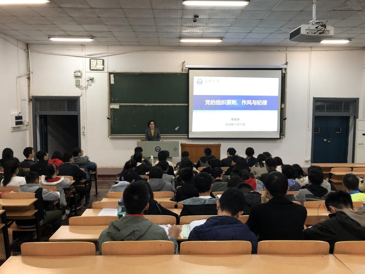 2018年11月11日晚,水利水电学院党委书记、第九分党校校长程连珍为第九分党校第62期入党积极分子培训班全体培训学员讲授《党的组织原则、作风和纪律》。