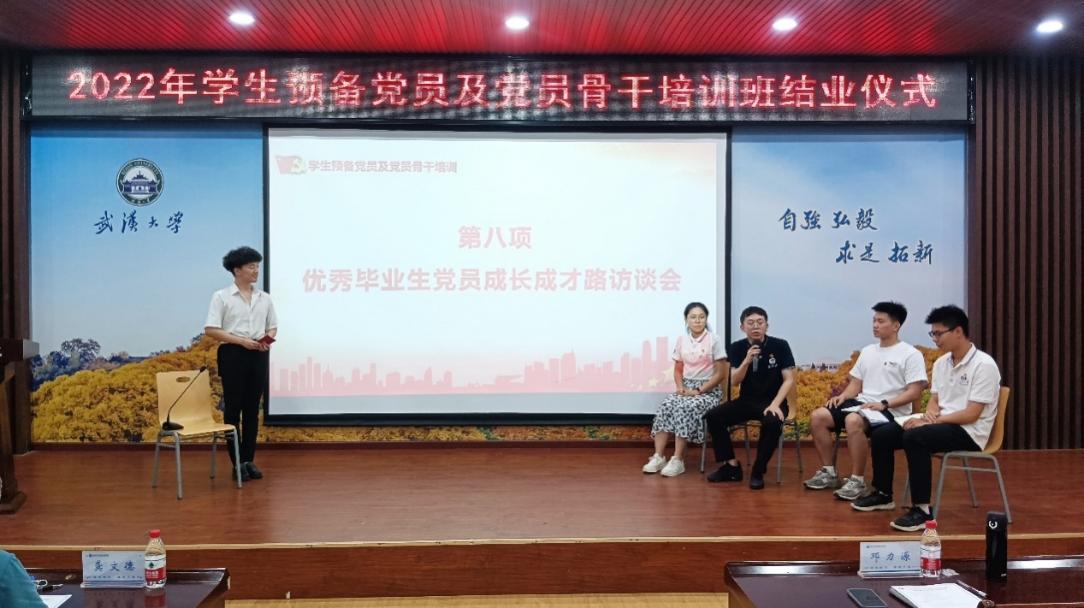 结业仪式的最后一个环节是我院优秀党员毕业生成长成才路访谈会。本次优秀毕业生党员成长成才路访谈会邀请到了优秀毕业生党员邓力源、吴雪薇、黄骞、苏辰晔等四位优秀毕业生党员代表,他们结合自己的经历,分别从考研、学生工作以及就业等方面为同学们答疑解惑,根据同学们提出的问题与大家做了充分而深入的交流,学员们获益匪浅。