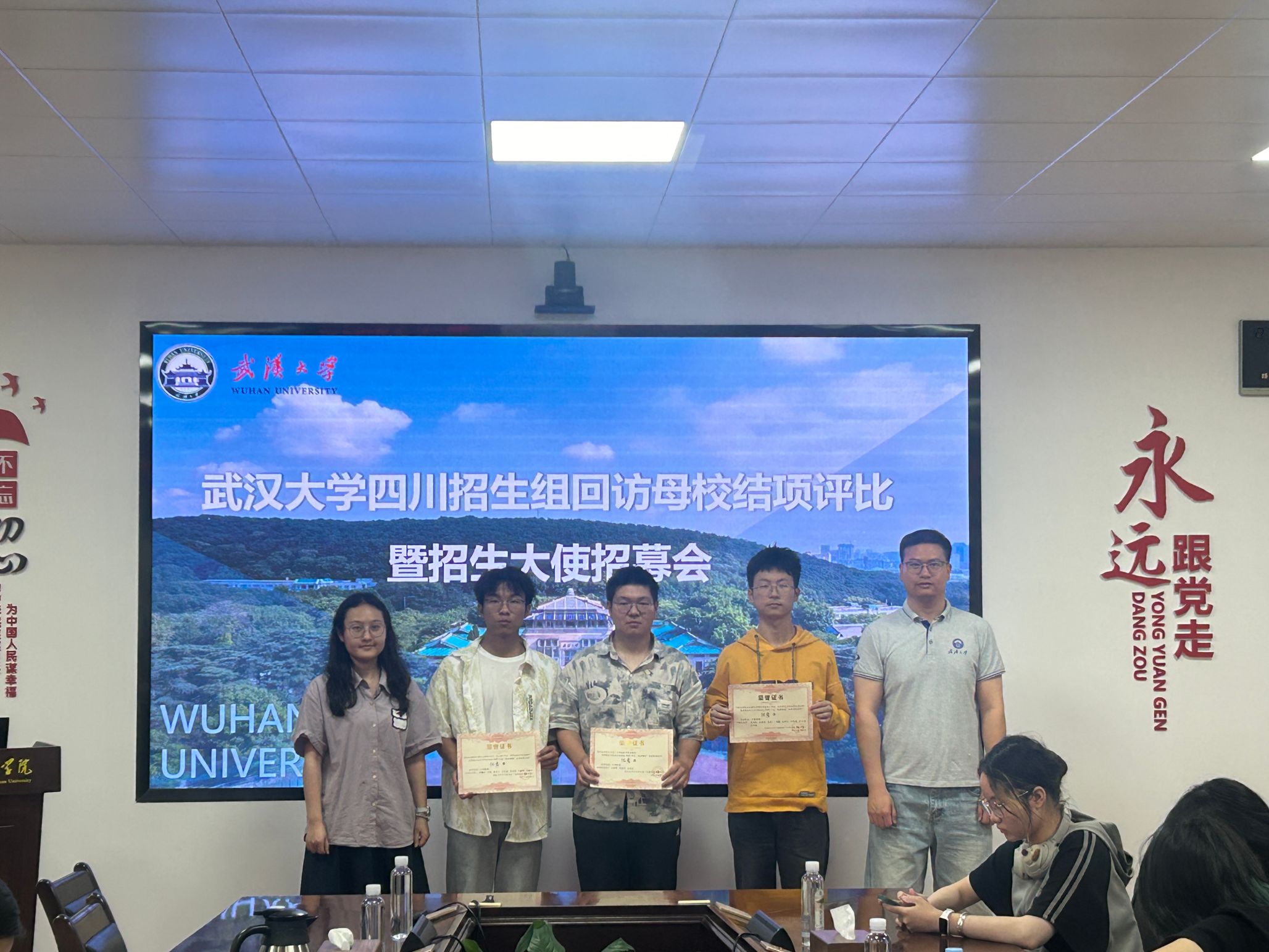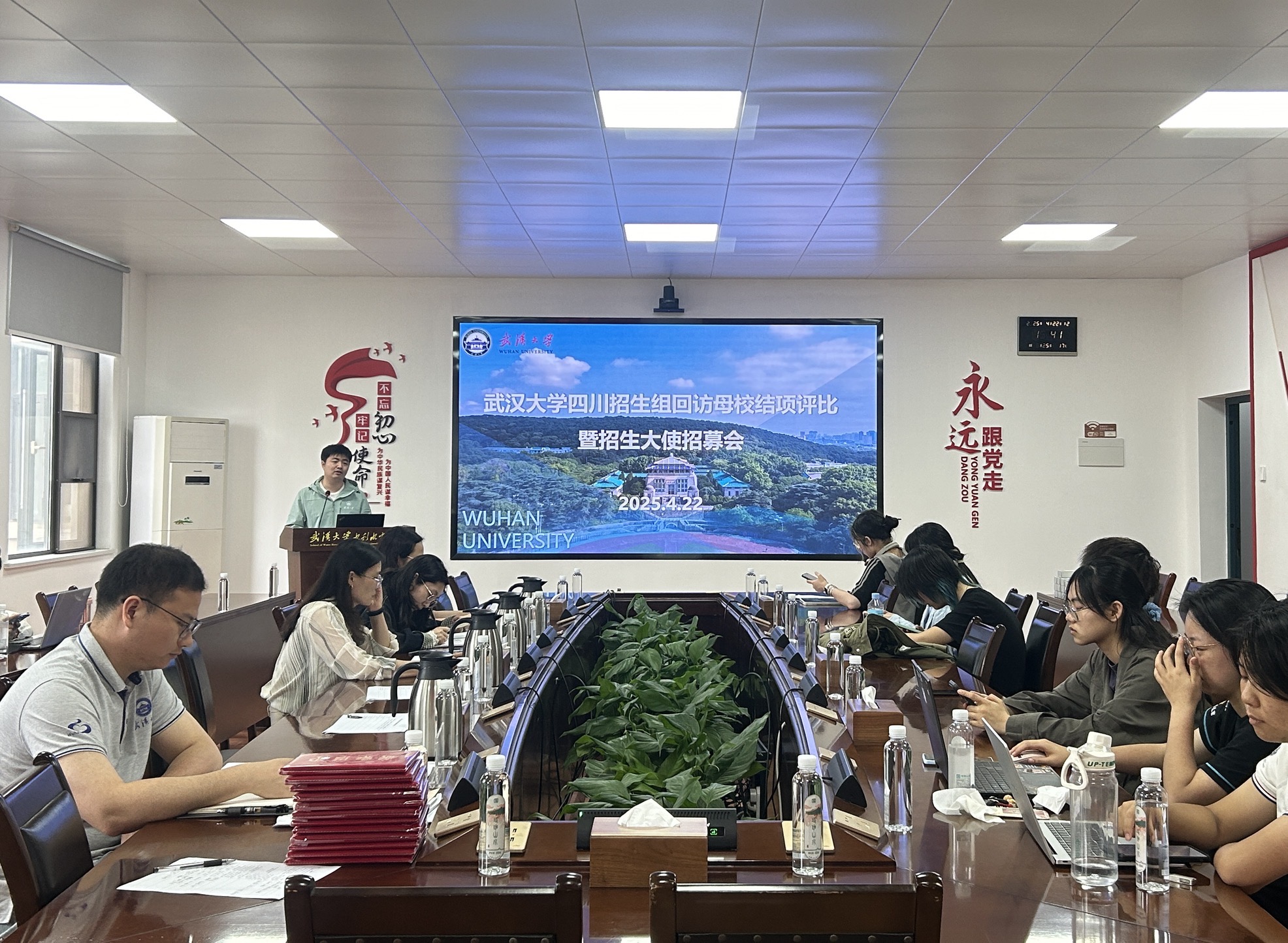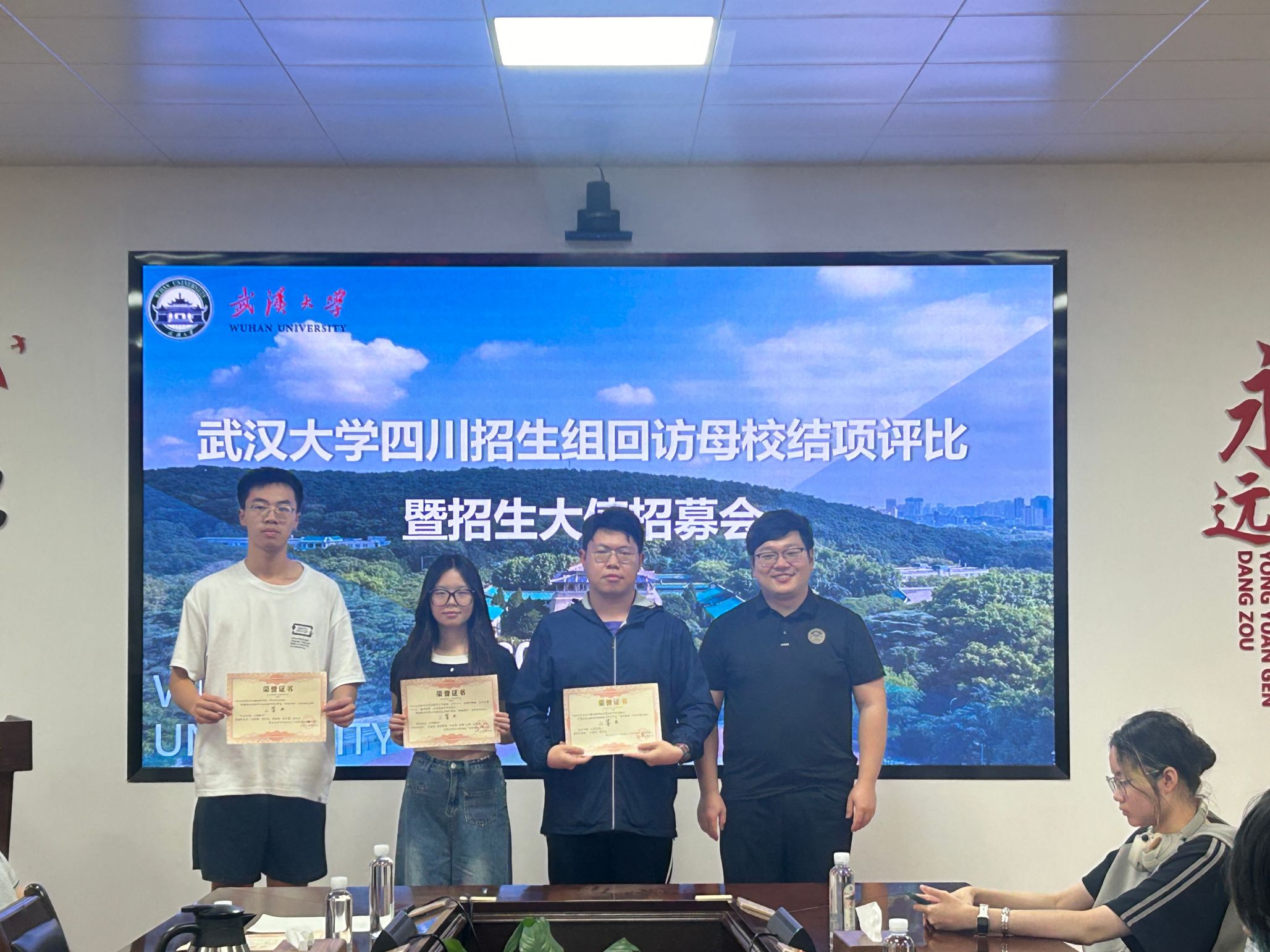 4月22日下午,武汉大学四川招生组在学院8220会议室举行2025年“回访母校”专项实践结项评比暨招生大使招募会。四川招生组组长、学院党委副书记左志香,招生组副组长于鹏杰、陈曼雨、田文祥,招生组老师许笑星、万柳柳参加会议,会议由田文祥主持。
