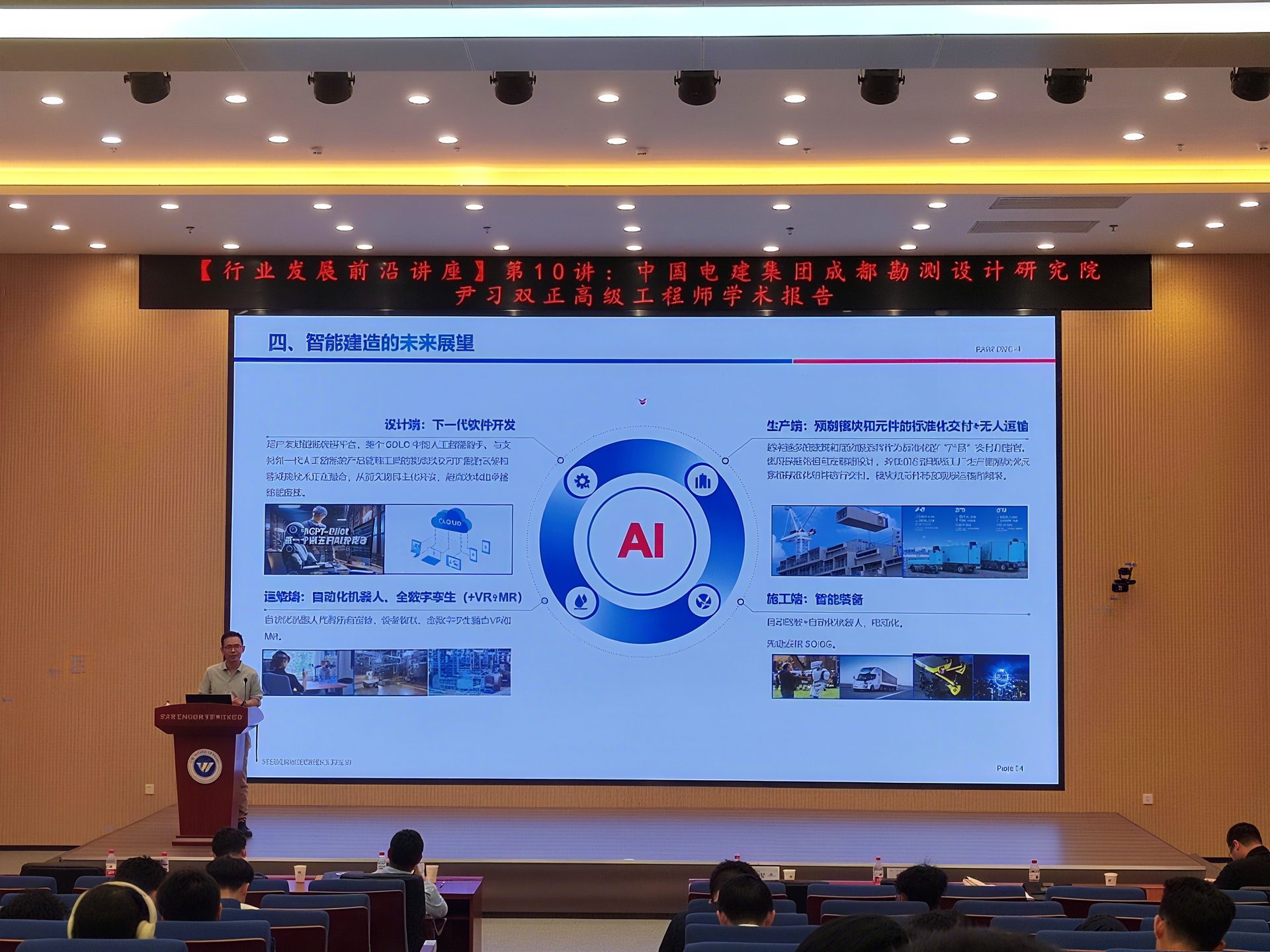 5月14日下午,学院主办的《行业发展前沿讲座》第10讲在水资源工程与调度全国重点实验室109报告厅顺利举行。本次讲座特邀中电建成都院数字工程分公司总经理尹习双担任主讲嘉宾,以“工程公司智能建造之路”为主题,为在场师生带来了一场关于智能建造技术发展与行业实践的精彩报告。