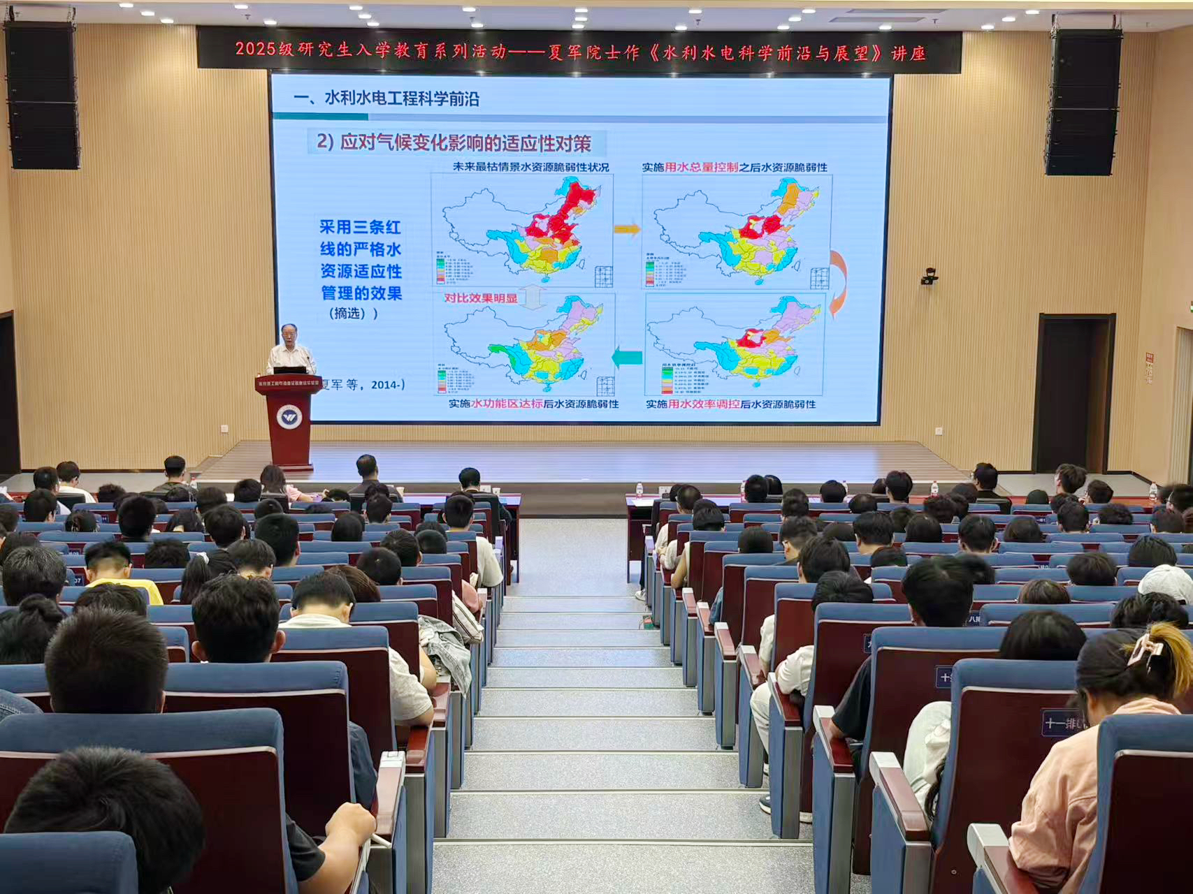 9月26日下午,中国科学院院士、著名水文水资源专家夏军为水利水电学院2025级全体研究生新生做《水利水电科学前沿与展望》专题讲座。学院院长刘攀主持讲座,党委副书记左志香、全体研究生辅导员和2025级研究生新生参加。