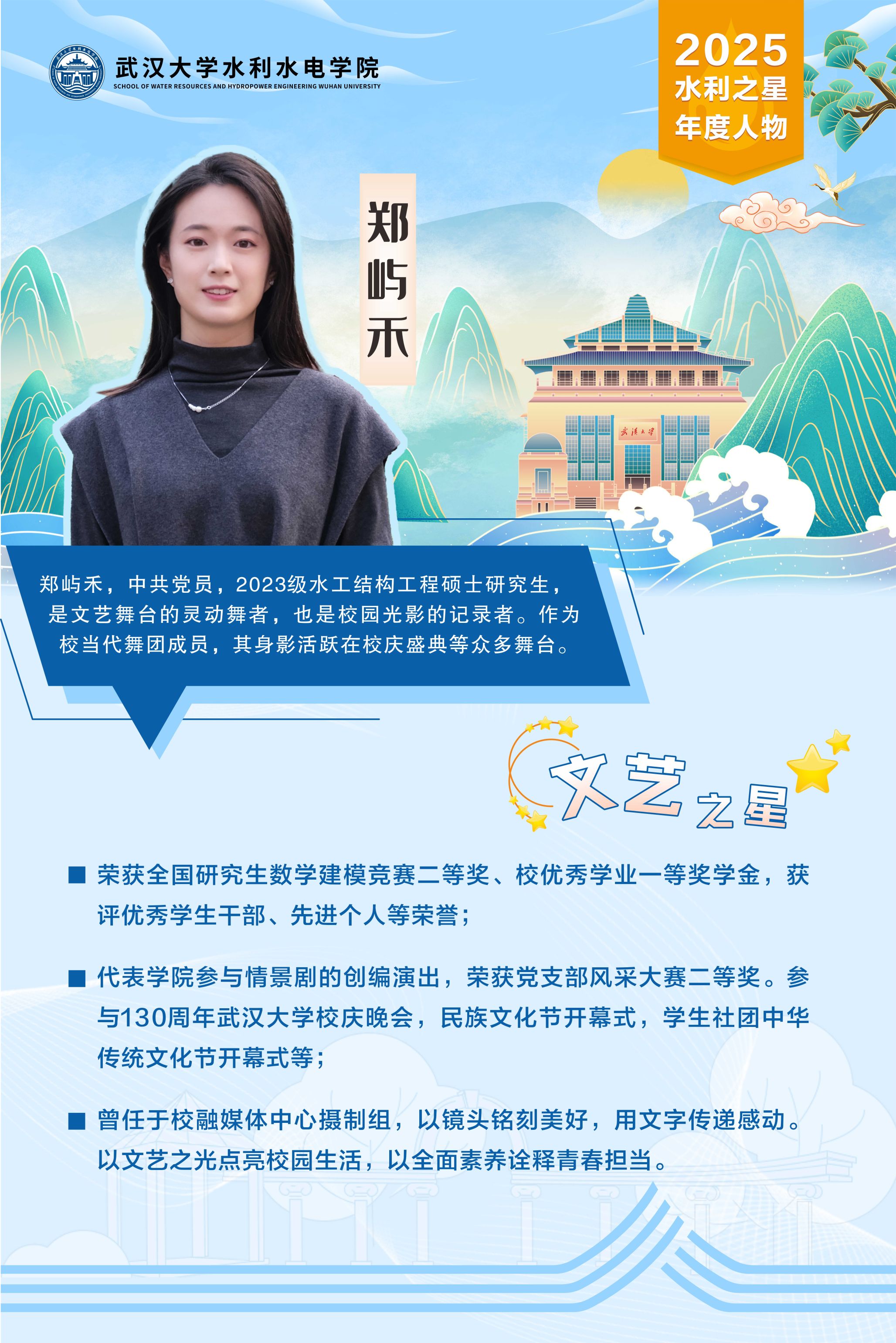 个人三度获评武汉大学社会实践先进个人,助力团队斩获国家级“三下乡”优秀团队、省级百强实践团队等多项荣誉;连续多年以核心成员、队长身份深耕社会实践,牵头开展第三届水利专业选调生校友调研走访、重走习近平总书记足迹(黄河长江下游)调研等实践活动;以兼职辅导员身份深耕育人一线,聚焦学生需求,全心全意为学生服务,凭借出色的表现入选兼职辅导员选苗育苗计划。她以水利人的实干担当扎根实习实践、赋能成长。
