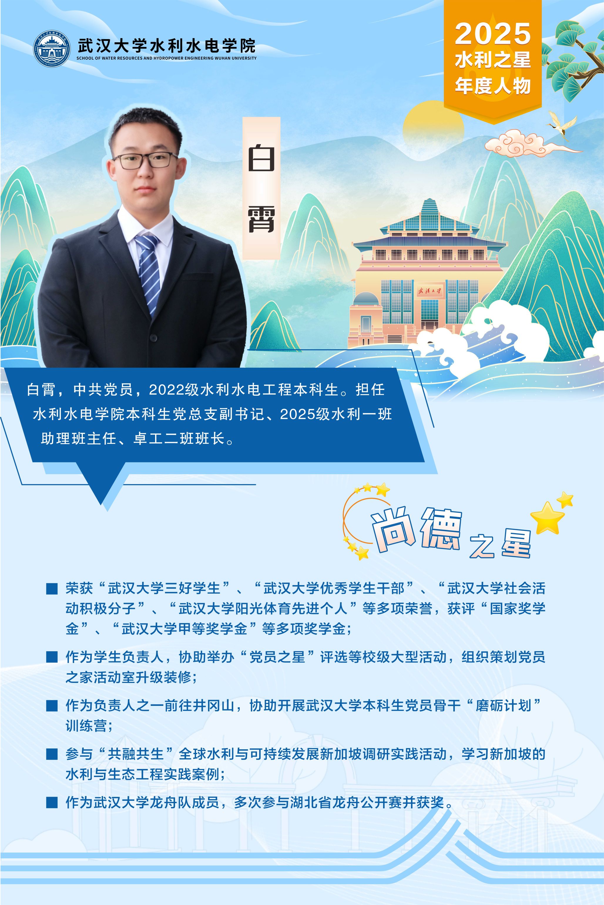 白霄,中共党员,2022级水利水电工程本科生。担任水利水电学院本科生党总支副书记、2025级水利一班助理班主任、卓工二班班长。他以党员本色扎根学生工作,于学术探索中砥砺深耕,在实践中勇立潮头,更在龙舟竞渡间凝聚团队力量,诠释着全面发展的青春担当。