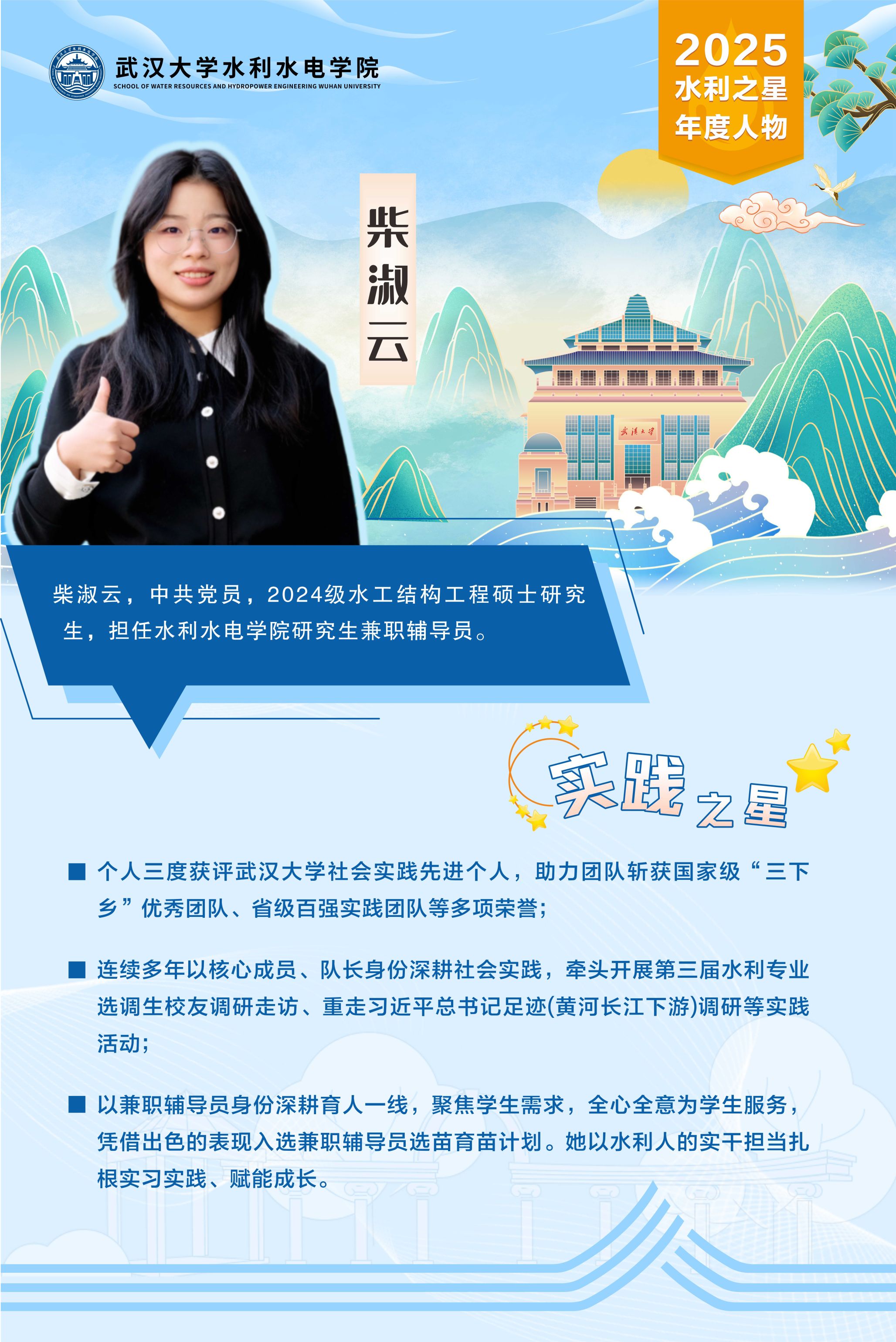 柴淑云,中共党员,2024级水工结构工程硕士研究生,担任水利水电学院研究生兼职辅导员。她以脚步丈量江河,以青春之笔丈量在祖国大地;更以热忱扎根育人一线,在实践中诠释担当。她用持续的耕耘,展现了水利青年知行合一、甘于奉献的实干底色。