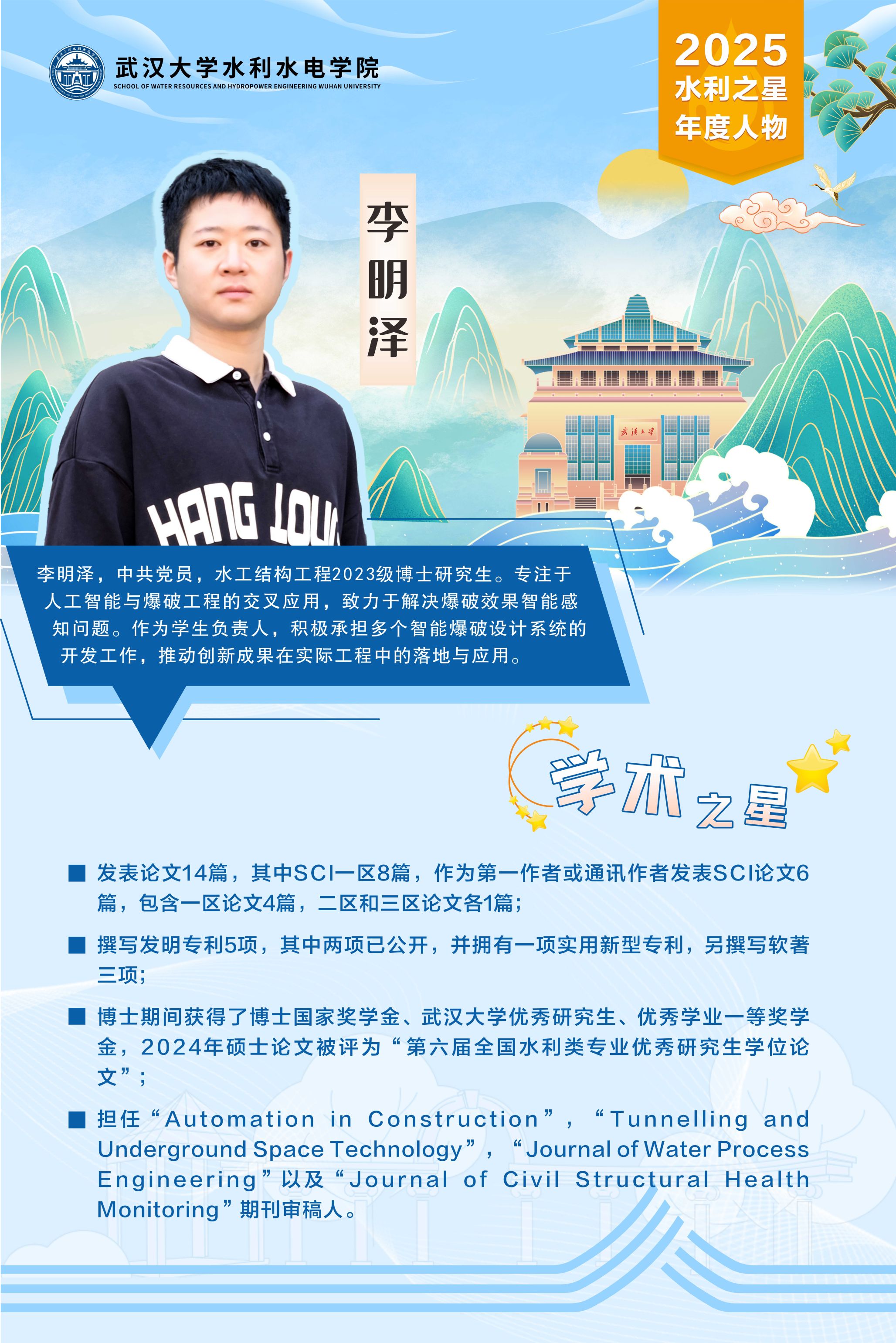 李明泽,中共党员,水工结构工程2023级博士研究生。他深耕智能破岩,致力破解爆破感知难题。以创新驱动工程跃迁,以笔锋书写学术高度,更以慧眼审阅领域前沿,展现跨界融合的科研锐气与全面发展的青年风采。