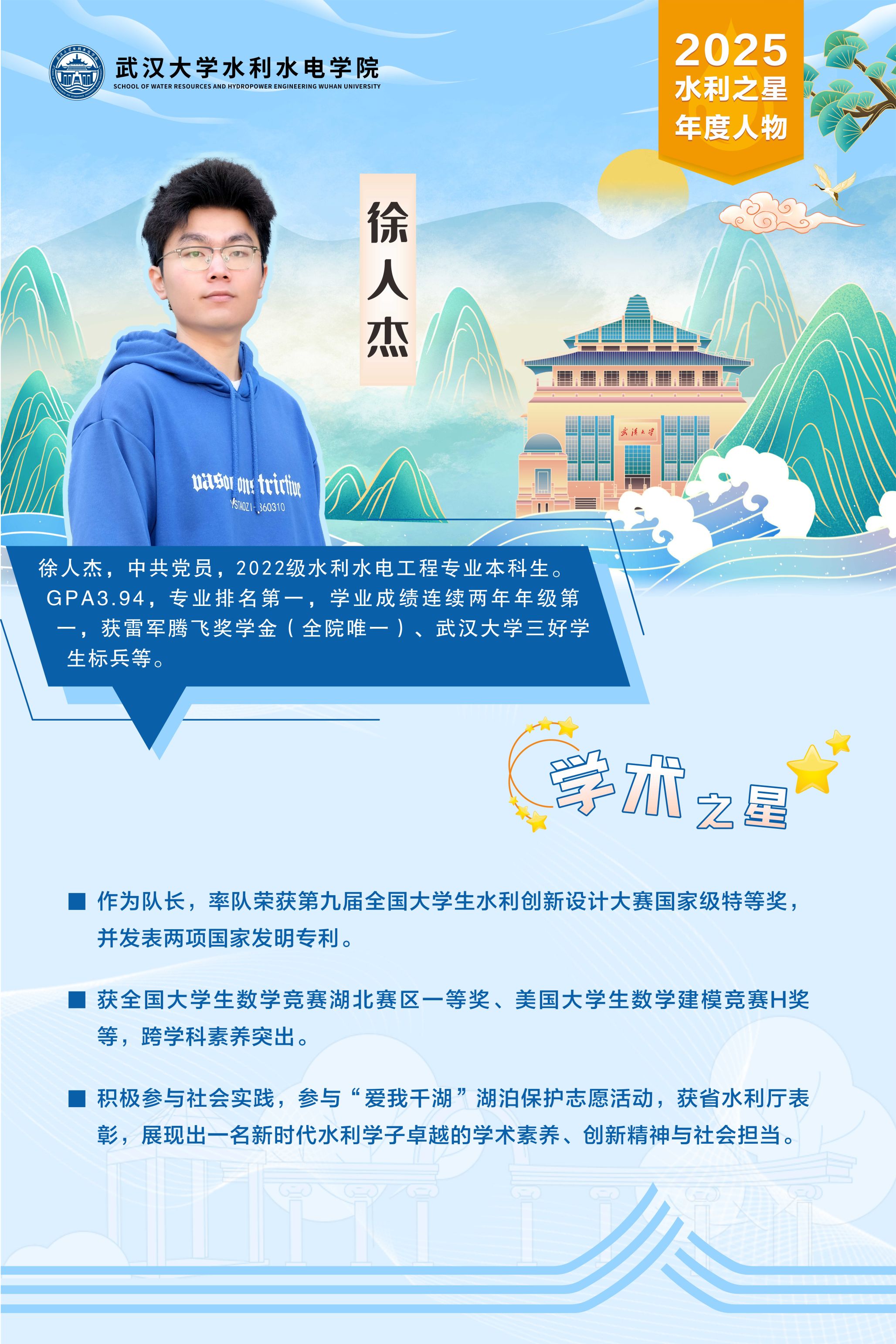 徐人杰,中共党员,2022级水利水电工程专业本科生。他以顶尖学识探求江河真理,以创新实践破解水利难题,更将智慧热忱倾注于绿水青山之间,展现了新时代青年卓越的学术追求、先锋魄力与赤子情怀。