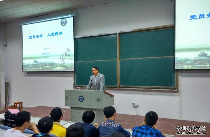 5月8日晚,武汉大学党委副书记、副校长王传中教授应邀在10-403教室为第一、九分党校第57期入党积极分子们上了一堂以《党员条件和入党程序》为题的精彩党课。水利水电学院党委书记程连珍,党委副书记周玉霞、张栋梁,历史学院党委副书记刘洪波以及部分辅导员参加了本次党课学习。党课由张栋梁主持。