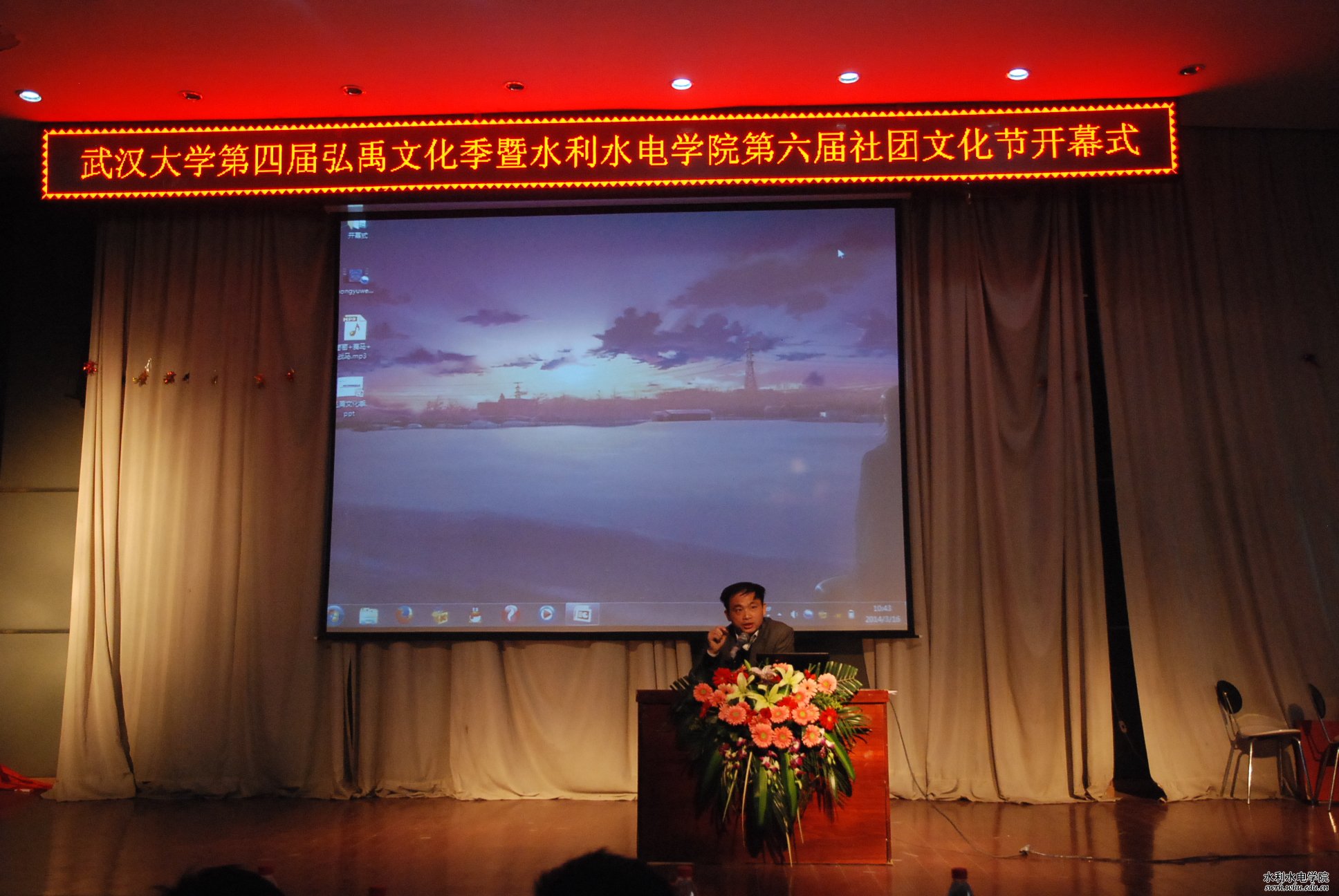 3月16日上午,武汉大学第四届弘禹文化季暨学院第六届“盈盈一水”社团文化节在文理学部教五多功能报告厅顺利开幕。校团委副书记李勤、校学生会主席刘邦、院党委副书记王志军、院水利工程系教授胡铁松、学生工作办公室徐国章、韩琦、向昭、孟勇等老师以及各兄弟院系团学联学生干部代表出席开幕式。