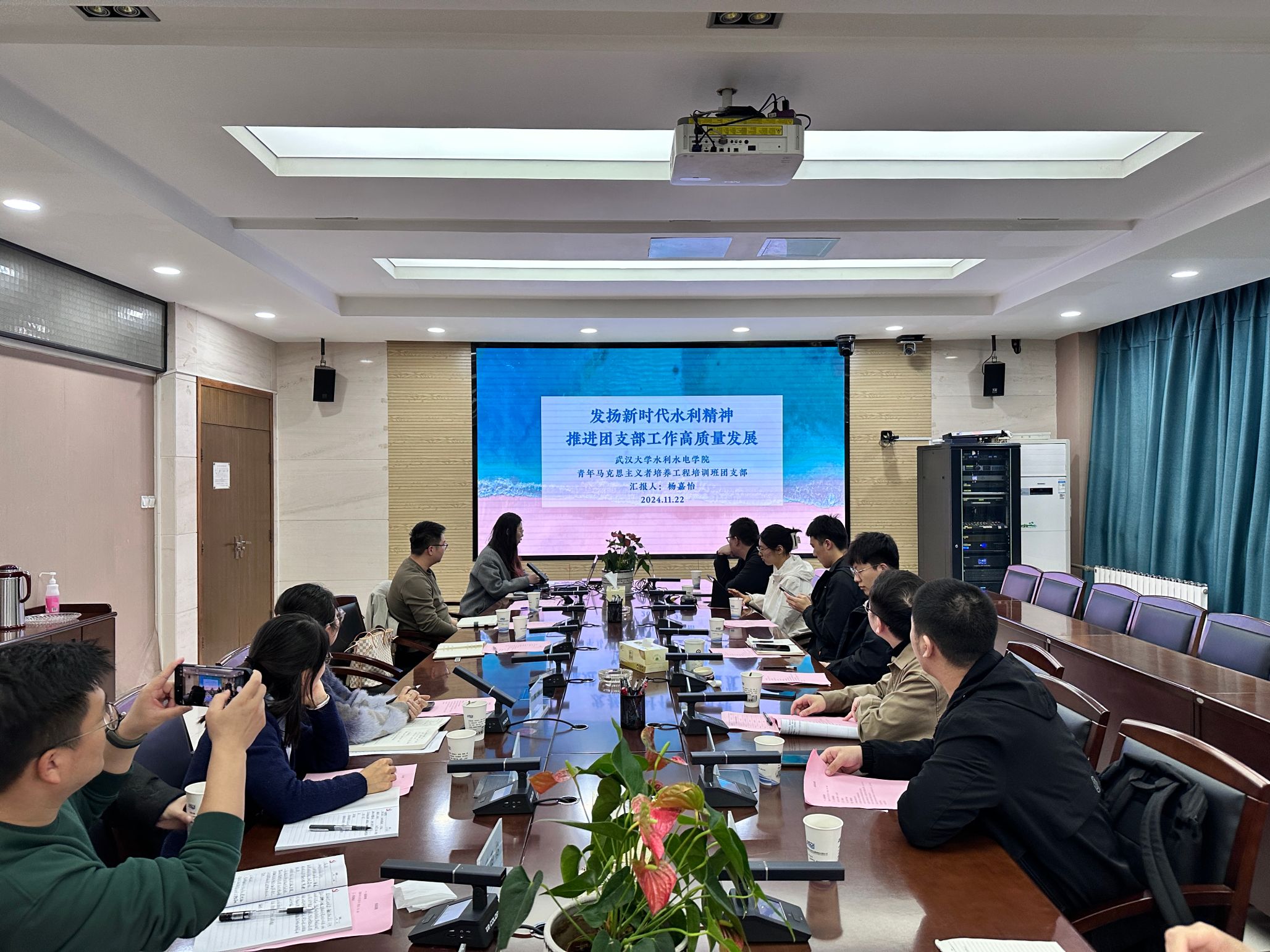 学院本科生杨嘉怡,分享青年马克思主义者培训班团支部建设情况。青马班团支部始终坚持以新时代水利精神为指引,紧扣青年成长的实际需求,培养了一批批信仰坚定、素质过硬的青年马克思主义者,支部连续两年获评“武汉大学五四红旗团支部”。学院本科生金妍岑,作为武汉大学长江流域防灾减灾体系与能力现代化调研社会实践队的成员,分享了题为“智慧赋能水安全,数窥江河守安澜”的调研心得,讲述自己置身实践中,倍感使命在肩,鼓励同学们以智慧与担当,为母亲河守护安澜,为水利事业高质量发展奉献青春力量!