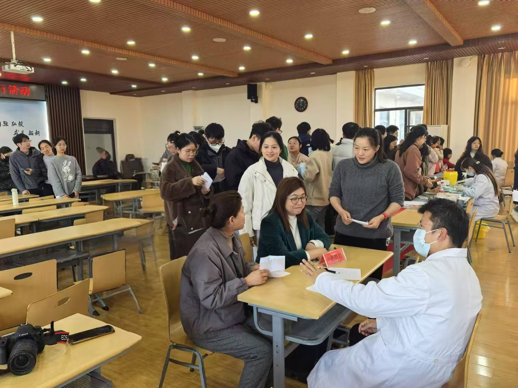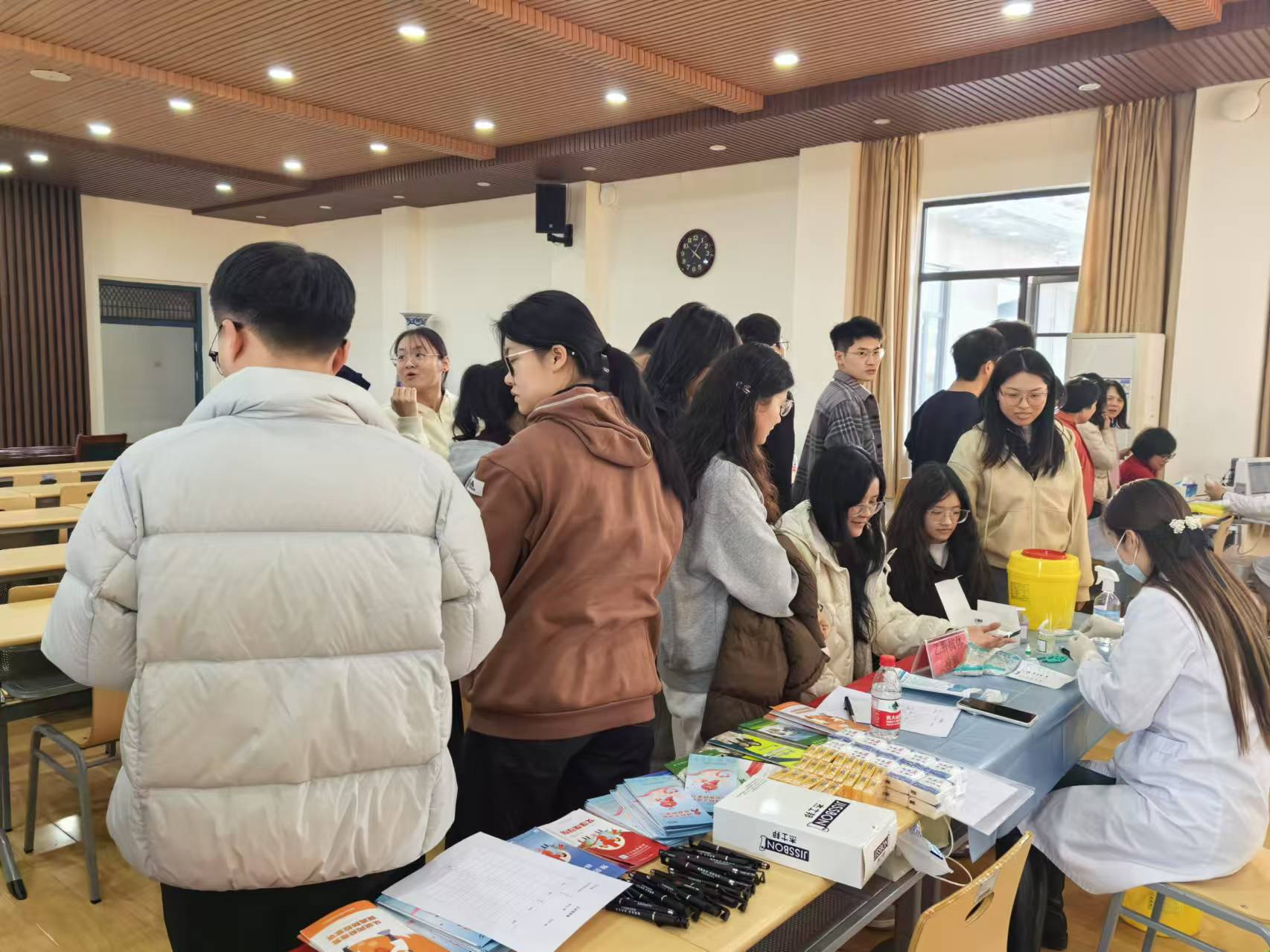 讲座介绍后,专家们现场为师生们进行了血压、糖化血红蛋白检测、乙肝抗体检测、骨密度检测及中医义诊等。义诊现场非常火爆,师生们纷纷排起了长队。“我一直都没能挂上李医生的中医号,没想到今天在学院看上了,太幸运了,这样的活动真好。”一位老师拿着李医生开具的处方开心的说到。“原来我的乙肝抗体已经弱阳性了呀,那我明天就去校医院接种加强针”一位老师感谢地对医生说道。