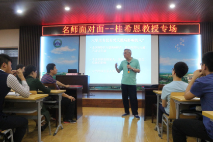 5月12日晚,“名师面对面——桂希恩教授专场”在学院8328报告厅举行。武汉大学中南医院桂希恩教授、院党委副书记周玉霞老师、院党委副书记张栋梁老师、院团委副书记徐晟老师出席了本次活动,来自学院的300余名本科生和研究生参加了活动。