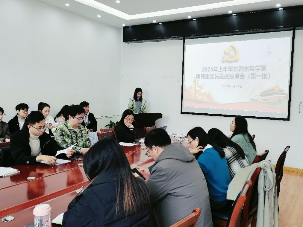 2025年3月17日下午3点,水利水电学院2025年上半年第一次研究生党员发展预审会在8111会议室召开。学院党委副书记左志香,研究生辅导员陈曼雨、许笑星、万柳柳出席会议。本次会议旨在严格对标党内关于党员发展的高标准、严要求,对发展对象的综合表现进行考核把关,选择符合党员发展要求的优秀同志进行发展。
