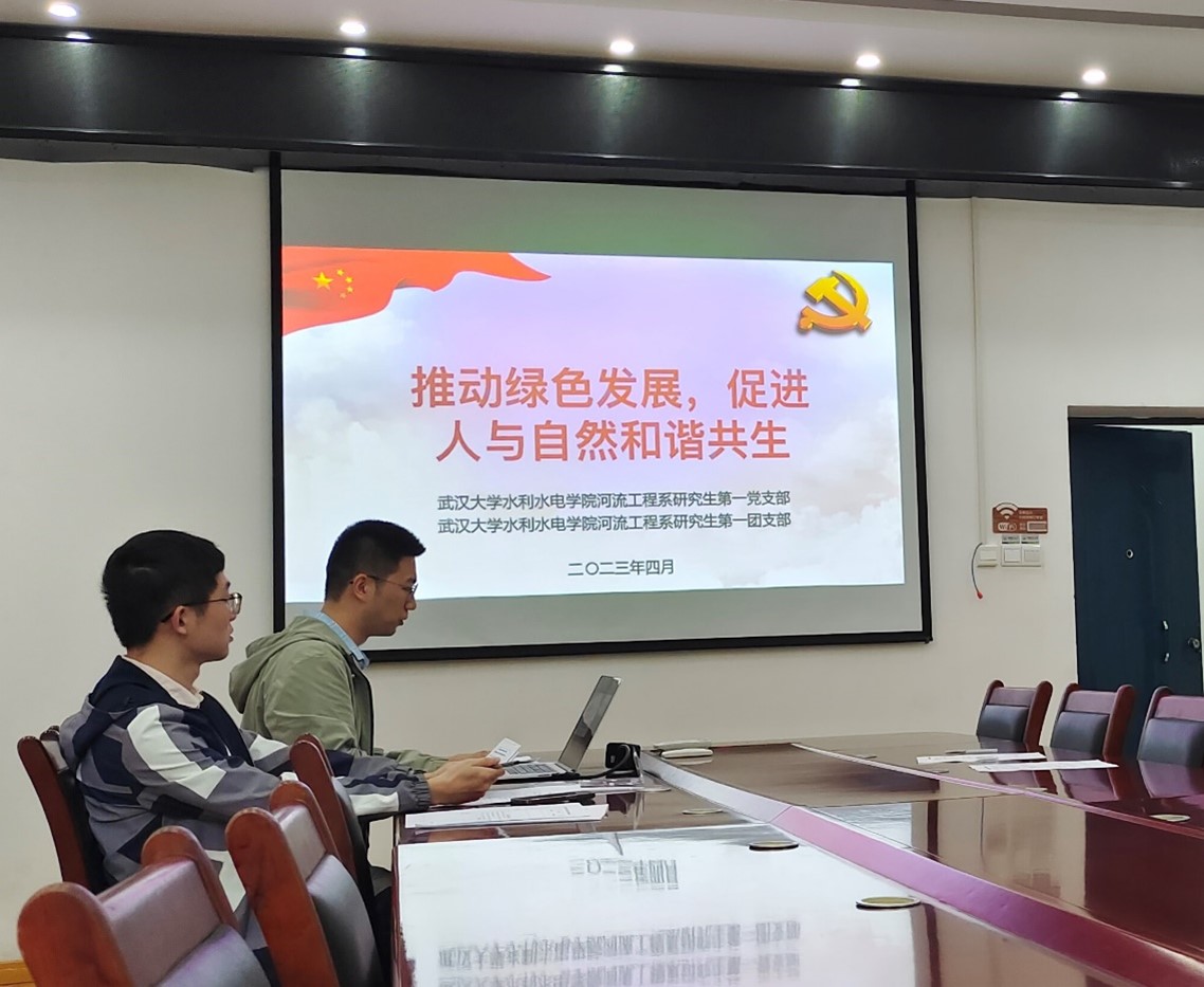2023年4月27日17:00,河流工程系研究生第一党支部在武汉大学工学部八教8111会议室召开四月组织生活会,为深入学习贯彻习近平新时代中国特色社会主义思想和党的二十大精神。本次会议包括三项议程:一、共同学习“推动绿色发展,促进人与自然和谐共生”主题团课;二、讨论曾毅航同志的发展问题;三、学习“缅怀先烈事迹,继承革命精神”主题党课。会议由党支部书记朱斌同志与团支部书记徐欢同志共同主持。