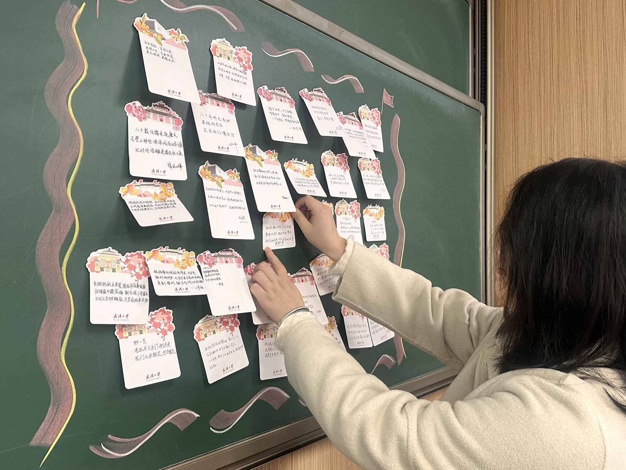 最后,围绕“纪念中国人民抗日战争暨世界反法西斯战争胜利80周年”主题,每位支部成员创作“三行诗”。用简洁、真挚的语言,表达对革命先烈的深切缅怀、对伟大胜利的由衷礼赞、对世界和平的真诚祈愿,并将全体党员创作的三行诗统一书写在特制的卡片上,集中粘贴于主题展示板,形成一道独特的“情感寄语墙”,进一步升华活动情感体验。