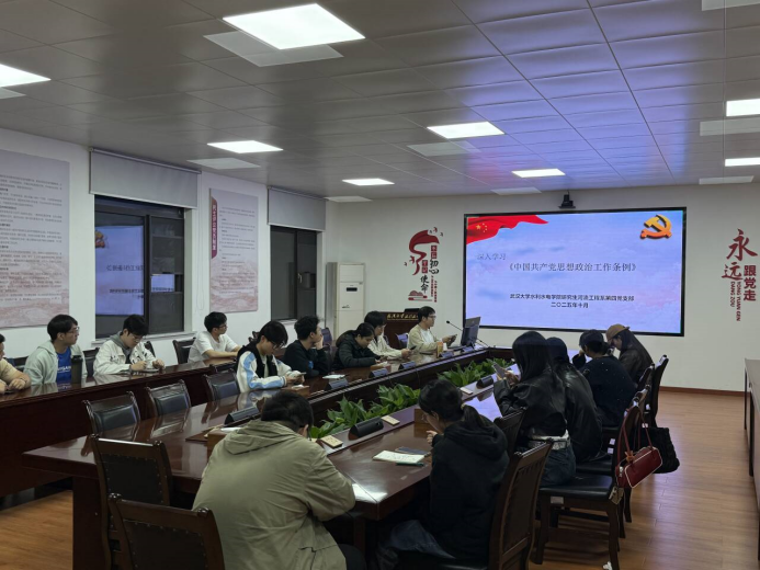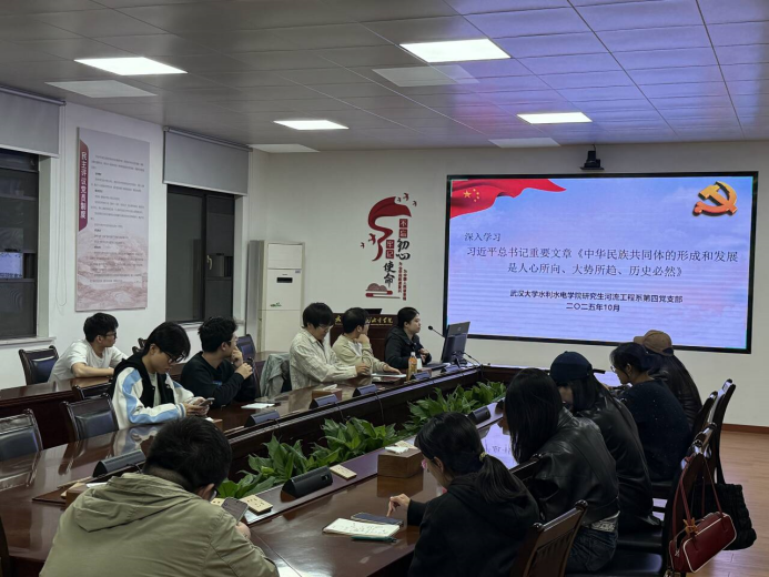 2025年10月28日晚7点,河流工程系研究生第四党支部于工学部八教8220会议室召开十月理论学习会,本次会议包括四项议程:一是深入学习《习近平谈治国理政》第五卷的核心要义;二是深入学习习近平总书记重要文章《中华民族共同体的形成和发展是人心所向、大势所趋、历史必然》;三是深入学习《中国共产党思想政治工作条例》;四是开展2025年武汉大学党员基本培训第二次集中大课党支部课后研讨。本次会议由党支部书记蒙小兵同志主持,共有22名正式党员、1名预备党员、7名发展对象及入党积极分子、5名共青团员出席本次理论学习会。