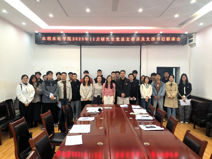2025年11月11日下午15:00,水利水电学院2025年11月研究生党总支委员及支部书记联席会在工学部八教8111会议室顺利召开。会议由研究生党总支学生负责人周慧明同志主持。学院党委副书记左志香、研究生辅导员许笑星、研究生辅导员万柳柳和研究生党总支委员及各支部书记参加会议。会议的主要任务是听取研究生党总支委员及支部书记联席会指导意见,并针对党支部工作中的问题展开交流。