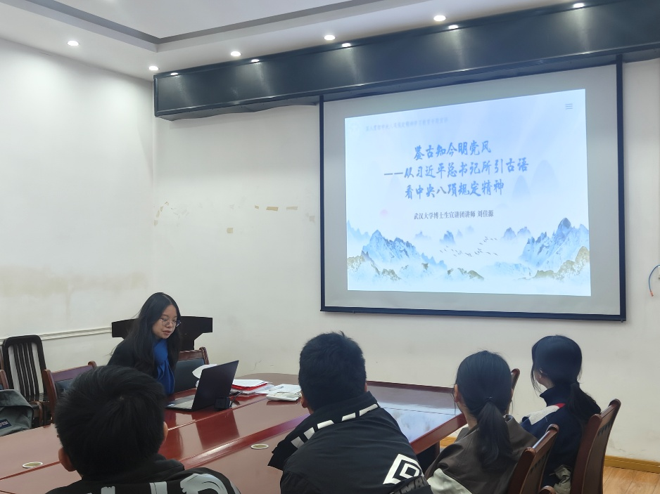 会议第三项,由武汉大学博士生宣讲团讲师刘佳源同志带领支部全体成员深入学习《鉴古知今明党风——从习近平总书记所引古语看中央八项规定精神》。刘佳源同志首先系统阐述了中共中央八项规定及其精神的深刻内涵与时代意义,指出这是全面从严治党的重要抓手,体现了党自我革命的坚定决心。随后,引经据典,通过三句经典古语展开深入解读:以"没有规矩,不成方圆"阐释八项规定作为党内铁规的重要作用,强调全体党员必须严守纪律底线;以"俭则约,约则百善俱兴"剖析勤俭节约的深远意义,指出这既是优良传统,更是净化政治生态的关键;以"尽小者大,慎微者著"强调作风建设要从小事着手,在细微处见真章,做到防微杜渐。刘佳源同志将传统文化智慧与中共中央八项规定精神相融合,内容翔实,说理透彻。通过这次学习,支部成员进一步强化了纪律观念、节俭意识和细节意识,将在今后的工作学习中自觉对标对表,严格要求自己,以实际行动持续巩固拓展作风建设成效,永葆共产党员的先进性与纯洁性。