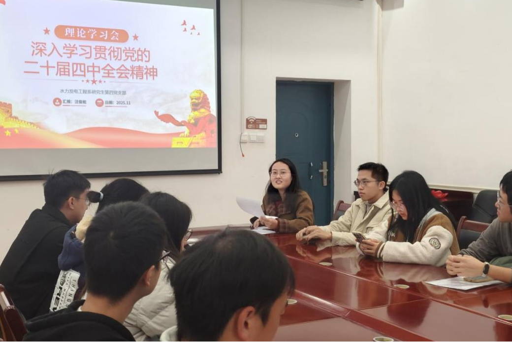 2025年11月20日下午4:30,水力发电工程系研究生第四党支部11月理论学习会在工学部8111会议室顺利召开,本次会议的主题为深入学习贯彻党的二十届四中全会精神。会议由党支部书记祝哲珺同志主持,水利水电学院研究生辅导员万柳柳出席本次会议。