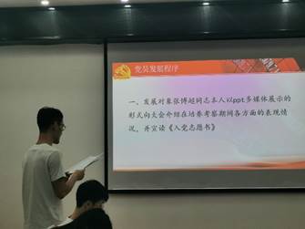 会议第二项议程,讨论张博超同志的发展问题。首先,全体起立奏唱国歌,组织委员张宇婷同志清点到会正式党员,本次到会正式党员人数符合开会要求。然后,张博超同志上台以PPT的形式从自身基本情况、入党发展历程、自身优缺点、未来努力方向等方面对培养考察期间的表现进行了自我评价,并宣读《入党志愿书》。张博超同志的两位入党介绍人介绍了发展对象的基本情况,并一致表示赞同其加入中国共产党,组织委员张宇婷同志随后宣读了支部委员会对发展对象的综合意见。在素质测试环节,张博超同志围绕当前时政热点话题,针对美日澳印近期举行的四方会谈表达了自己深入而独到的见解。接下来,到会成员对张博超同志的入党问题发表意见。之后经正式党员不记名投票,赞成人数超过应到会有表决权的正式党员的半数,通过张博超同志的入党决议。支部书记赵学银同志宣读了《关于接收水利水电学院水利系研究生第五党支部接收张博超同志为中共预备党员的决议(草案)》。