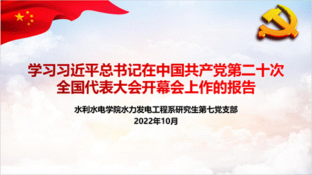 2022年10月28日19时30分,水力发电工程系研究生第七党支部开展了十月组织生活会。本次会议内容为“学习习近平总书记在中国共产党第二十次全国代表大会开幕会上作的报告”。支部书记陈治平同志主持会议。