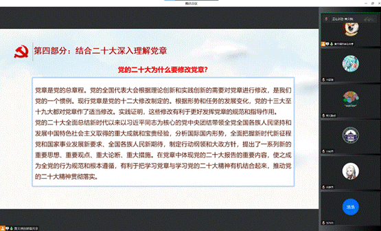 会议第一项,黄文祺同志带领支部成员共同学习《中国共产党章程》的主要内容,重点讲解了中国共产党的指导思想、党员标准、党员的权利和义务等内容。