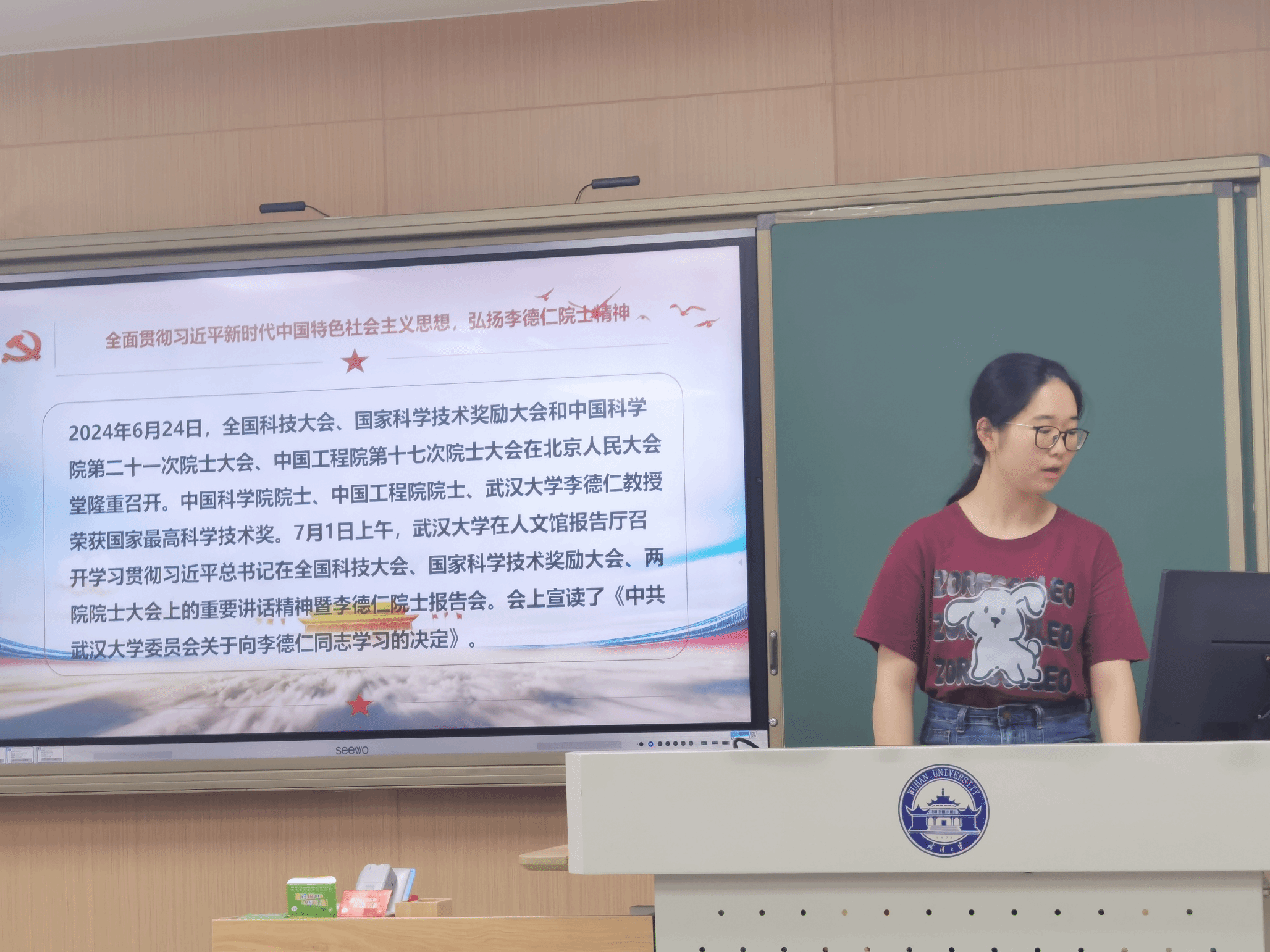 在这一环节中,郑宇同志带领党员同志们学习李德仁院士的精神,重点讲解了李院士在科学研究中的奉献精神和创新意识。李院士始终坚持将国家的需求作为研究的出发点和落脚点,强调科学研究要服务于国家发展战略。他的事迹激励着在场的每一位同学,大家深感作为新时代的青年学子,肩负着推动科学进步和社会发展的责任。郑宇同志鼓励大家要学习李院士勇于探索、不怕困难的精神,努力在各自的研究领域中有所突破,尤其是在水文与水资源研究中,要关注实际应用,积极参与到国家重大项目中去,为解决水资源短缺和生态环境问题贡献自己的智慧和力量。