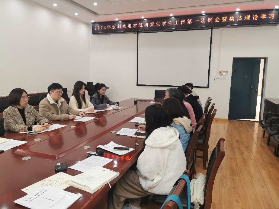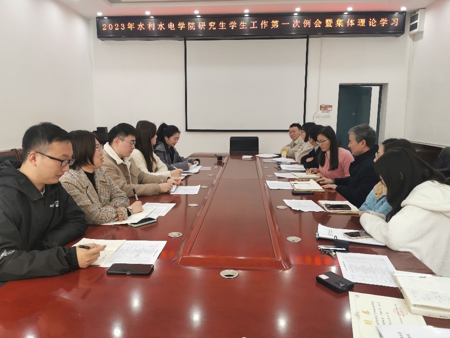 2023年3月2日下午三点,2023年水利水电学院研究生学生工作第一次例会暨集体理论学习在工学部8教8111会议室顺利开展。学院党委副书记龚文德,研究生辅导员左志香和陈曼雨出席了本次会议。学院第二十二届研究生会主席团成员王暄宇、王雨欣、蒋婉玉,第二十一届研究生会主席团成员赵一林、孙小雨、夏源彬参与会议,进行集体理论学习和研究生会工作开展研讨。