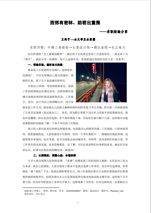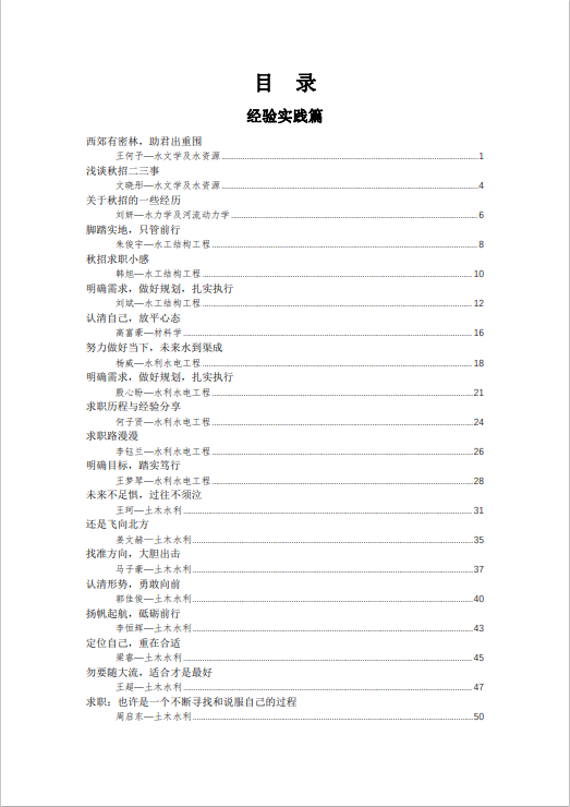 本次活动邀请2023届水院硕博毕业生将择业过程中的经历与感悟记录下来,形成一份稿件进行投稿。稿件收集完毕,就业实践中心全体成员对收集到的55份稿件进行整编工作,包括错别字检查、稿件排版、投稿人信息校对等,并根据稿件的内容将其分类。此外,在今年的投稿作品的基础上,又摘选了往年(2019-2022年)毕业生的优秀作品,并附上相关信息资料,最终形成了2023年水利水电学院研究生就业约稿集。