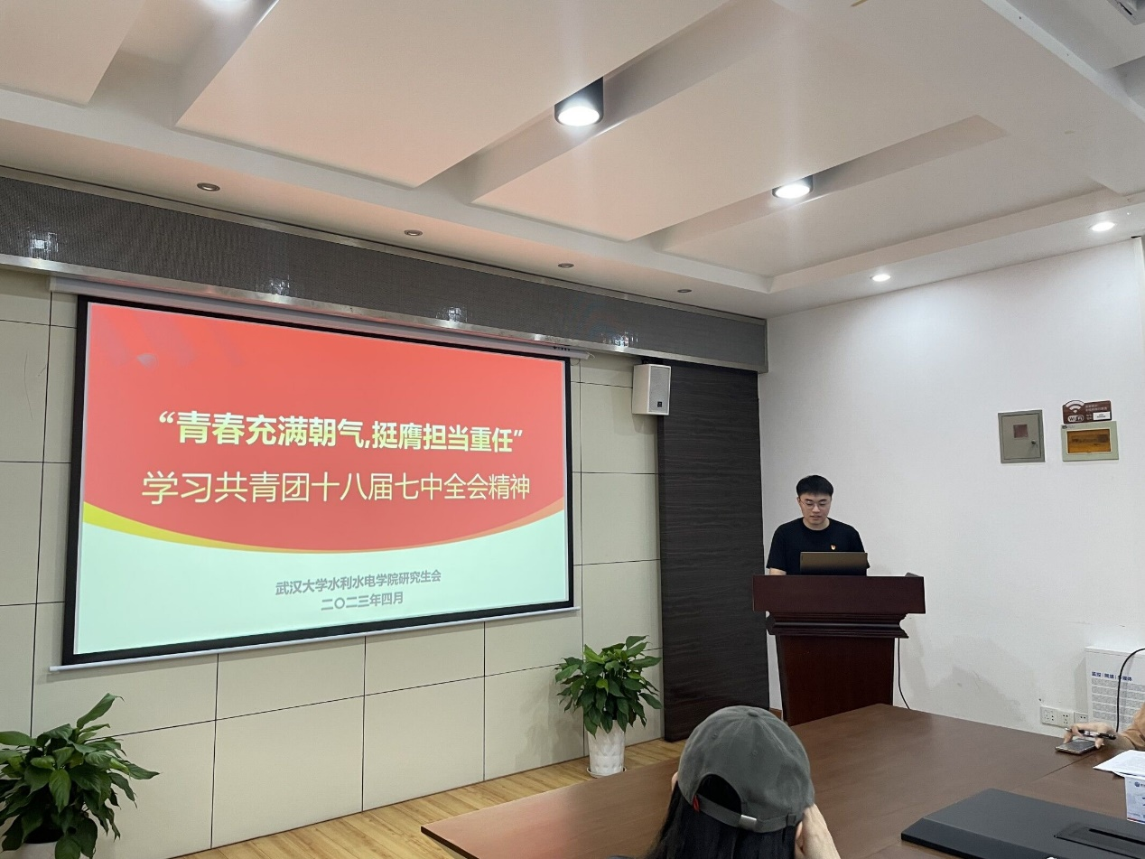 图2 院研究生会主席团成员王暄宇同学引领大家学习共青团十八届七中全会精神