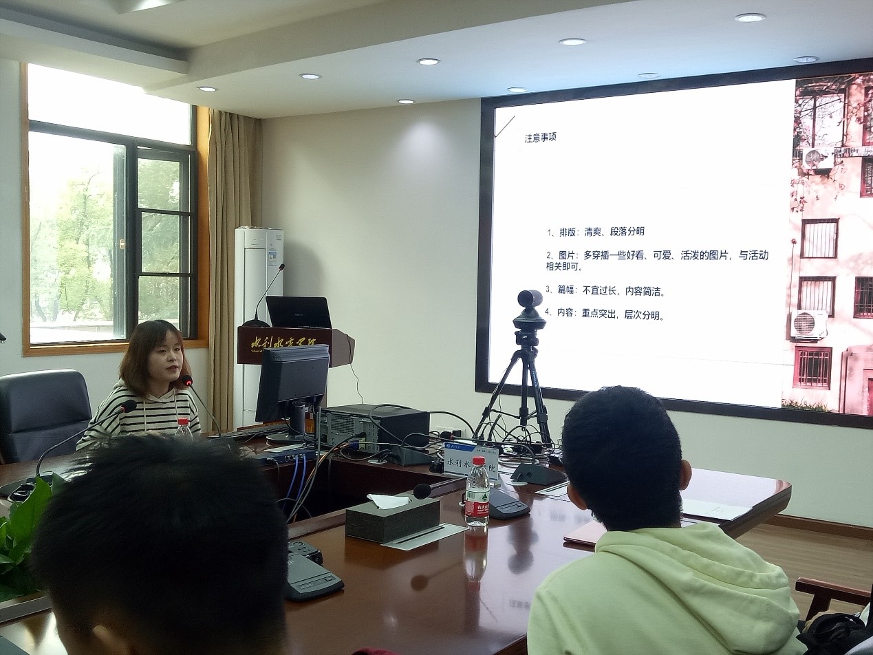 首先,会议主讲人谢雨航以“如何撰写活动推文和新闻稿”为主题进行了经验分享,讲解了如何撰写活动推文和新闻稿以及其中的写作要点和注意事项,介绍了院研究生会经费报销的具体要求和注意事项,分享了自己在做学生工作中遇到的一些状况并提出今后如何有效避免问题的发生。