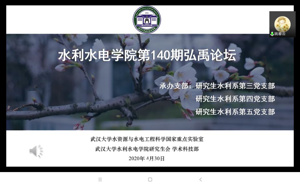 4月30日上午,学院第140期研究生“弘禹论坛”在腾讯会议app举行。教师季斌和管光华,研究生辅导员左志香,学生主讲人朱瑞、赵子龙、陈曼雨及相关专业研究生代表出席。本次论坛由研究生水利系第三党支部、研究生水利系第四党支部和研究生水利系第五党支部联合承办。