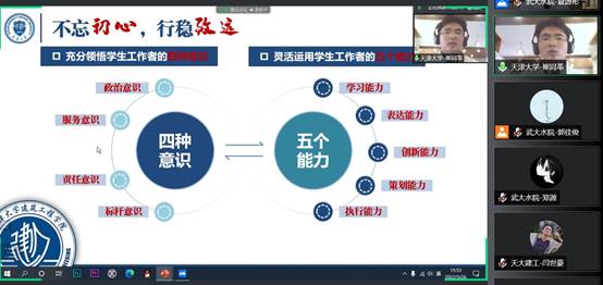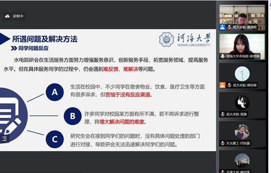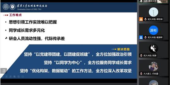 武大代表郑源同学介绍了在疫情这个特殊时期下,水院研会遇到的具体问题与具体解决历程,并就其个人在研会中的定位分享了各位成员心态调整、齐心协力解决困难的过程。