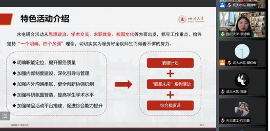 四川大学水利水电学院研究生会代表李诗婉同学就思想政治、学术交流、求职就业以及校园文化等方面给我们分享了相关研会活动。其中主要包括麦穗计划、“职掌”未来系列活动和综合素质课,综合提高研究生们的学术能力和创新技能,培养思想政治、文化、身体与心理、职业道德素质和社会能力,并为学生就业提供相关方向指导。
