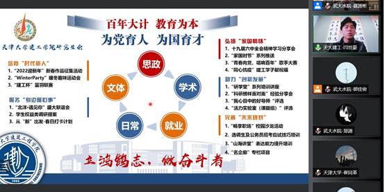天津大学建筑工程学院研究生会代表闫世豪同学向我们分享了天大建工研会在思政、学术、文体、日常和就业五个方面的工作,通过各类研会活动让研究生们更加融洽地加入学院、尽快融于其中的学术氛围和学习生活,以提升思想觉悟、学术能力与生活技能,并且为同学们提供就业相关的资源与服务。