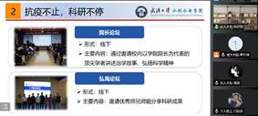 研究生会代表杨洪骁向我们分享了武大水院研会在疫情期间组织的相关活动,例如红色观影、百年学科风采、回望红船等——加强思想凝聚,顶尖学者、优秀学长论坛、程序设计大赛等——继续培养科研学术能力,学生线下晚会、游戏活动等——增强人际交流、烘托和谐氛围,就业约稿集、榜样说等——分享就业经验。