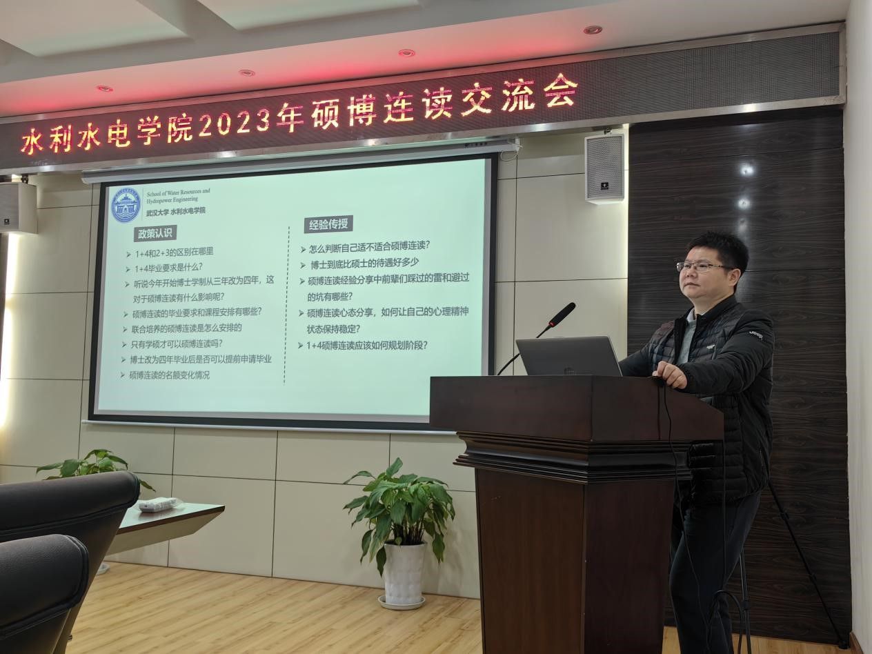 2023年12月15日14:30,由研究生会博士生分会主办的“硕博连读交流会”成功举办。水利水电学院分管研究生工作的伍靖伟院长,党委副书记左志香老师,研究生辅导员许笑星老师,教学办曾爱娥老师、万惟佳老师和张莉莉老师,以及分享嘉宾博士生邱钦焱、刘嘉禾、向代锋出席本次硕博连读交流会。