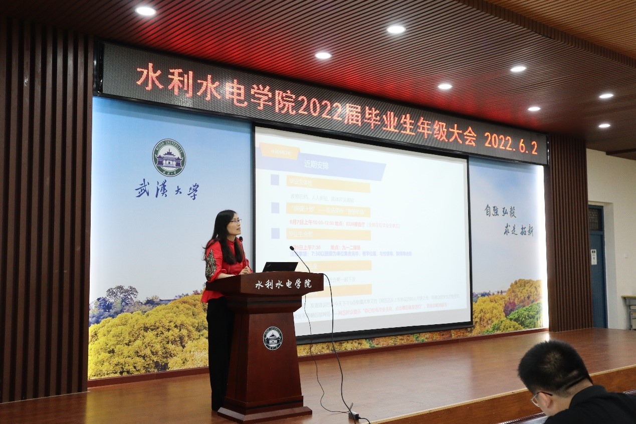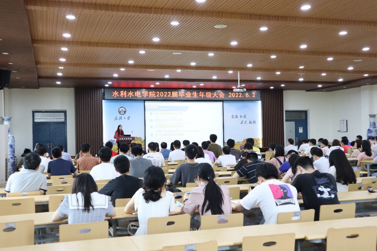 2022年6月2日,学院2022届毕业生年级大会在8328会议厅顺利召开。水利水电学院党委副书记龚文德,学生工作办公室主任、研究生辅导员左志香,研究生辅导员陈曼雨,兼职辅导员田永健以及全体2022届毕业生参加了此次会议,本次大会由水利水电学院研究生会就业实践中心组织和主办。会上,龚文德书记为全体2022届研究生进行了思想理论的教育工作。