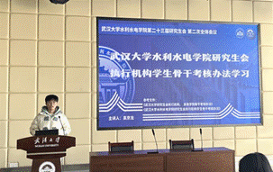 然后,主席团成员吴京龙带领研会成员认真学习“水利水电学院研究生会执行机构学生骨干考核办法”相关内容,深入开展骨干培训工作。吴京龙同学围绕考核办法详细介绍了考核内容、考核方式及细则、考核结果及运用等相关内容,同时他再次强调了研究生会成员应当保证自身纪律作风端正,远离红线、坚守底线,一同致力于建设一个高水平、高质量的水院研会。