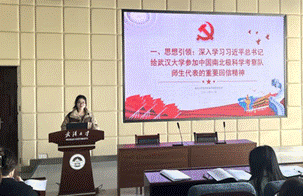 首先,主席团成员贾璐蔓领学“习近平总书记给武汉大学参加中国南北极科考师生代表的重要回信精神”。贾璐蔓同学带领大家回顾了习近平总书记给武汉大学参加中国南北极科考师生代表回信的内容,并对回信精神进行了深度解读。