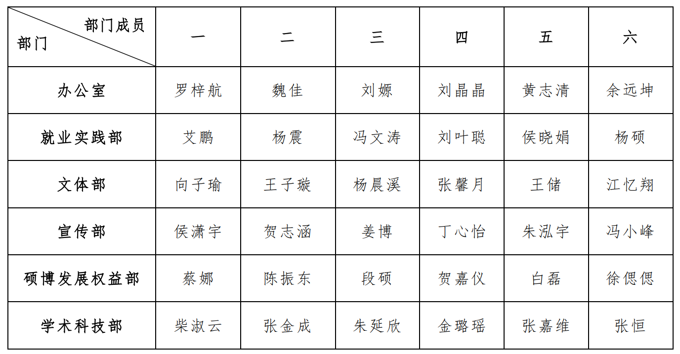 根据《研究生会章程》,第二十四届研究生会于2024年9月19日完成了研究生会各部门工作人员选拔,并于12月23日完成了部门人员的补招,经同学自愿报名、面试,并由主席团成员及各部门负责人讨论商定选出第二十四届研究生会各部门工作人员。现将任职结果公示如下: