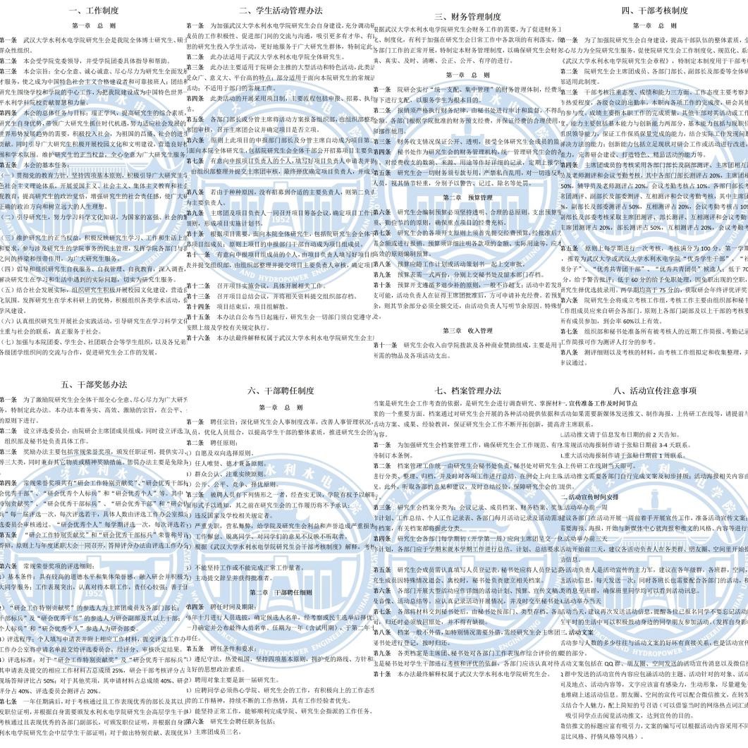 水利水电学院研究生会具有详细的研究生会工作管理规则、骨干选拔与考核规则和档案管理规则。每年定期规范召开研究生代表大会,每学期均会组织研究生会的述职考核工作。