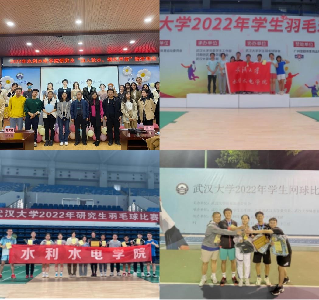 举办各类文体活动9次 文体类微信推送25篇 2022年武汉大学学生羽毛球赛,获男单第二、第五名,女单第九名,男双第九名,女双第九名,团体赛第九名 2022年武汉大学学生网球比赛,获男单第三名,女单第三名,女双第三、第五名 2022年武汉大学研究生羽毛球比赛,获团体总分第三名,男单亚军,女单第五名,混双第五名,女双第四、第五名,男双第五名 |