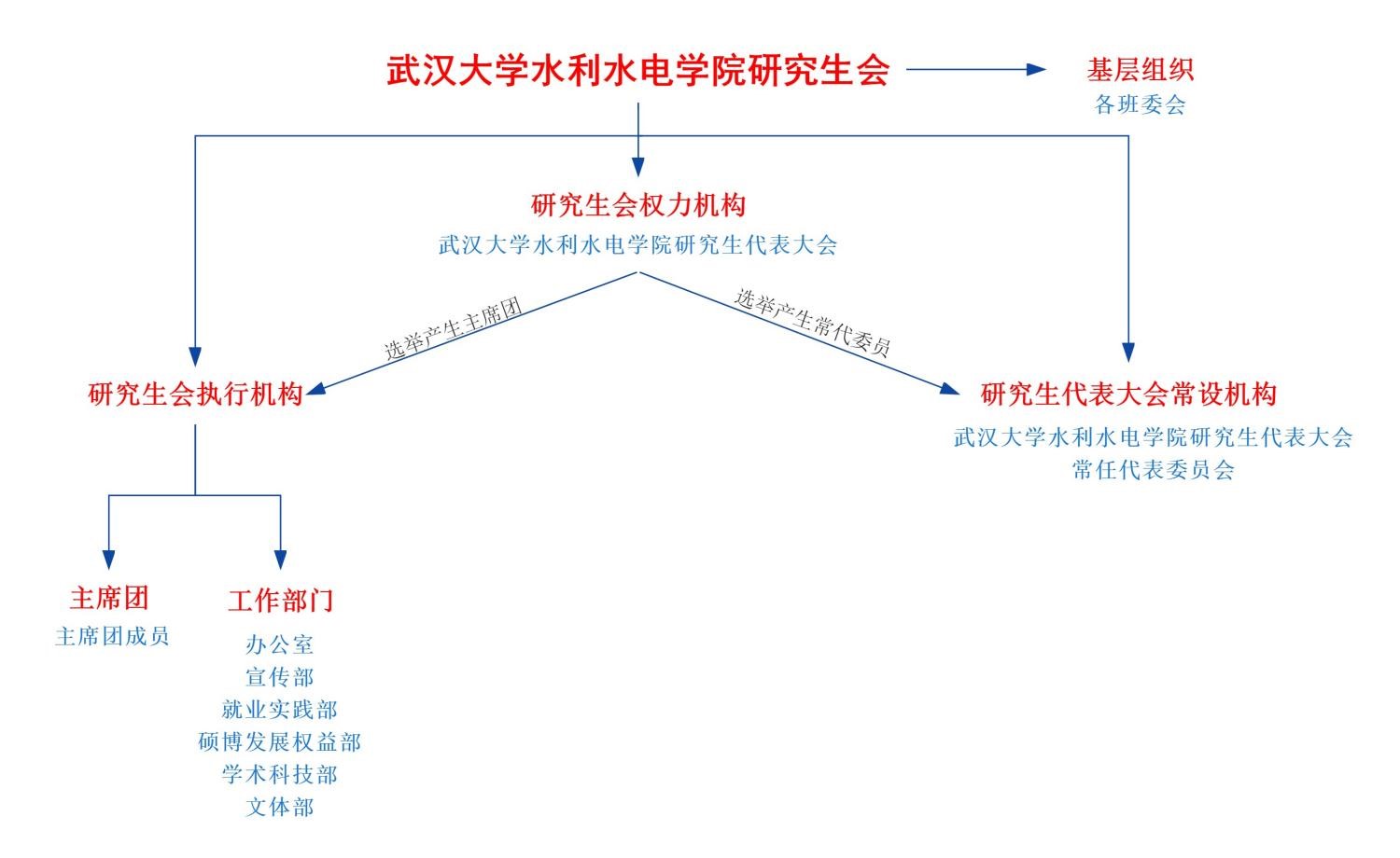 水利水电学院研究生会由权力机构研究生代表大会公开选举产生执行机构,执行机构架构为“主席团+工作部门”模式,工作部门分为办公室、宣传部、就业实践部、硕博发展权益部、学术科技部、文体部六个部门;同时按照要求并结合自身条件,成立了水利水电学院研究生代表大会常任代表委员会;研究生会基层组织为各班委会。