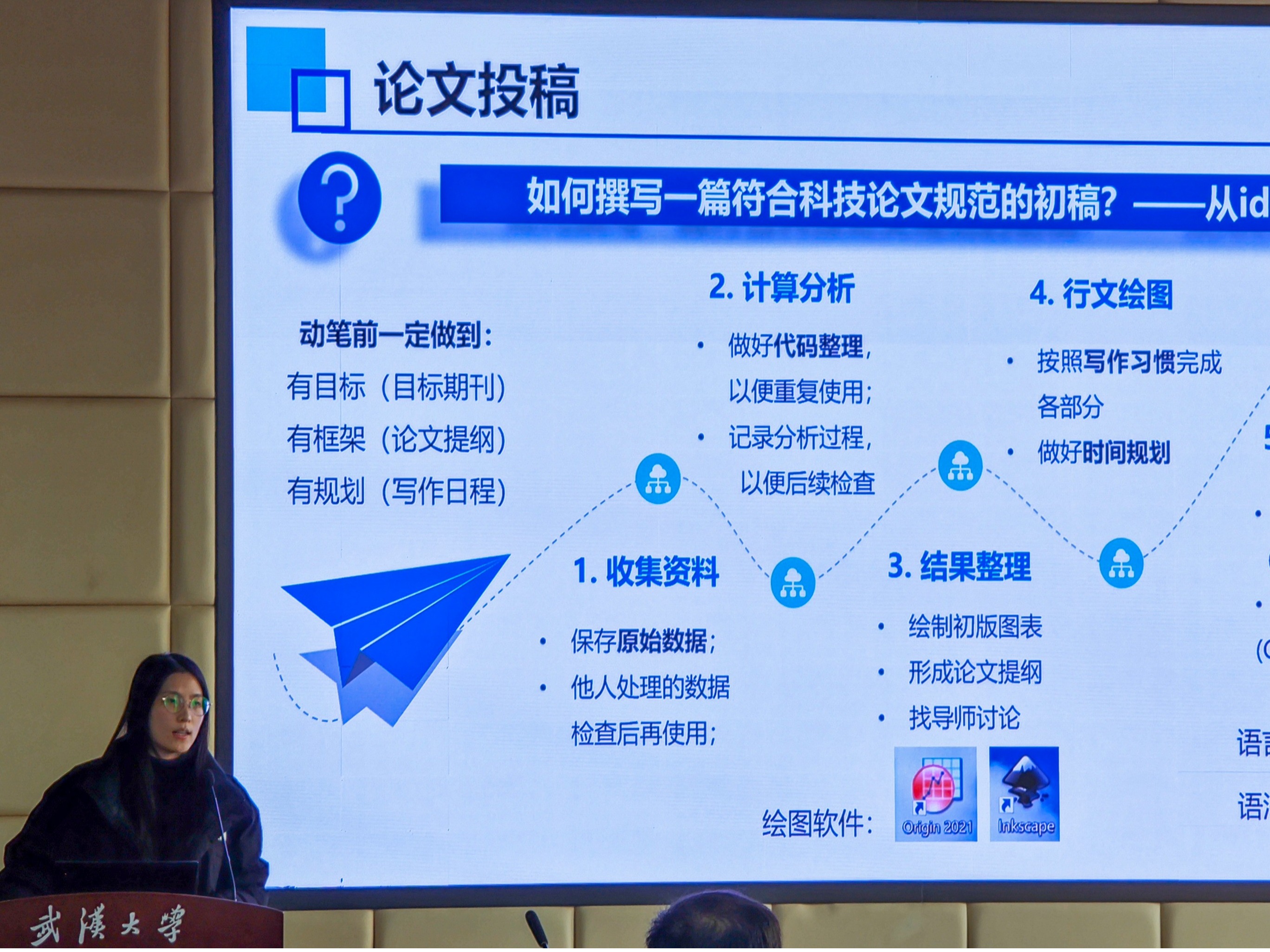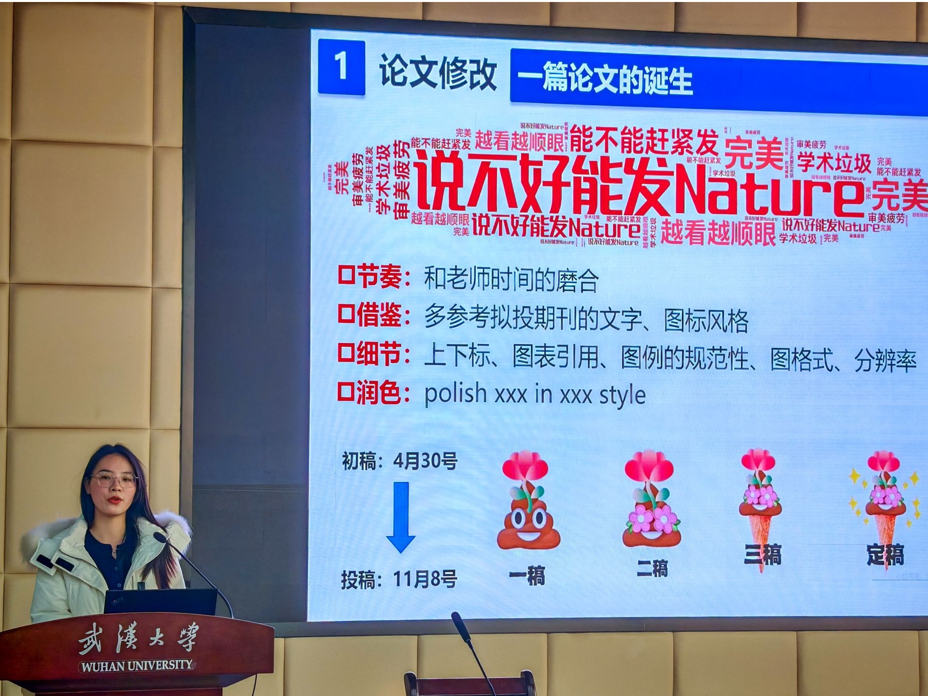 孙蓝心分享了撰写论文的策略与步骤,指出提升写作技能最快的途径是从模仿到创新,同时强调了学术资源获取与合作交流的重要性,要充分利用组会和学术会议获取组内、外界的学术资源;谢雨祚讲述了自己科研路上的坚持与感悟,提到要学会泛读、精读文献,建立知识体系,此外也要注意劳逸结合,保持稳定和持续的输出;雷旭昕提到要合理利用课题组已有成果,如组会上的数据分享与现成的代码,最终根据论文质量和期刊定位做出期刊投稿选择,并指出良好的心态与规划能使科研效率事半功倍;何立滢分享了文献检索经验,在进行期刊选择时,要考虑发文量、老师推荐、期刊分区、影响因子、方向、审稿周期等因素,并强调被拒稿后要调整心态重投他刊,选择有时候大于努力;杨忠坡介绍了知云翻译、Research Gate、Google Scholar、ChatGPT等科研神器,同时强调了论文要确保文章格式统一,出图质量明确、清晰、美观,英文写作地道、精炼、丰富。