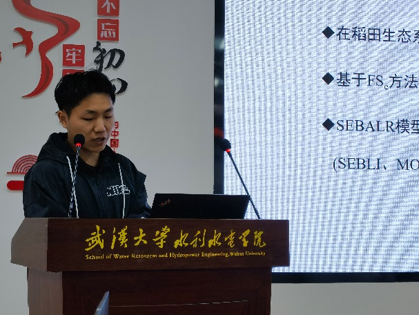 首先,博士生魏俊以《稻田生态系统蒸散发反演》为题进行学术报告。他介绍道,对于所有水利行业的研究者或从业者而言,都基本上有这么一个概念:无论是从全球尺度还是全国尺度来看,农业用水都是水资源消耗的一个主要途径,而稻田的蒸散发是影响农业用水的一个关键参数,致使众多的学者对稻田的蒸散发进行研究。除此之外,蒸散发也影响着地球的水循环过程和地表能量平衡过程。魏俊同学的研究以具有空间连续性好、成本低的基于遥感模型的方法对蒸散发进行估算,选取一个经验模型用于考虑平流对蒸散发的影响,而该经验模型自身的适用条件具有一定的局限性,因此,适用条件的考虑即为该研究的重点。他分别从温度梯度与传递载体两个方面探讨了适用条件的可行性,并最终得出结论——稻田生态系统需要考虑平流修正因子的适用条件;选取适当的遥感模型得出的结果更加准确。