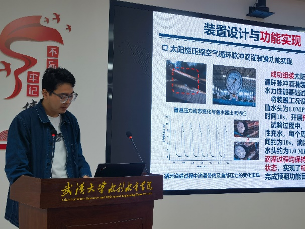 最后,硕士生孙皓以《太阳能压缩空气循环脉冲滴灌装置研发与水力性能试验》为题进行学术报告,硕士生孙皓指出:太阳能滴灌是当前国际未来灌溉的研究方向之一,因其可有效解决动力缺乏问题、降低系统能耗,具有高效节水能力,在全球已然得到广泛应用。但由于太阳能一方面能量密度低,易受到气象因素的影响,导致与其相连的滴灌装置水压波动明显,灌溉效果差。传统的滴灌系统往往依赖于高位水池,这不仅工程量大,而且无法适应不同的环境需求。因此基于太阳能-压缩空气耦合供能思路,报告提出了一种间歇式动态水压新型循环脉冲滴灌装置,并对装置开展水力性能试验、经济可行性分析以及综合性能评价。