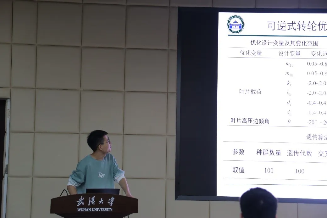 首先,胡赞熬博士以《可逆式水泵水轮机优化设计及试验研究》为题进行学术报告。报告首先介绍了抽水蓄能电站具有调峰填谷、调相、紧急事故备用等优点,是我国电力工业中不可或缺的主要组成部分。其次,目前抽水蓄能电站向着高水头、大容量的方向发展。超高水头下,抽水蓄能机组存在空化性能恶化、压力脉动剧烈的问题。因此,考虑到水泵水轮机转轮是抽水蓄能能量转换的核心部件,故开展该研究对保障抽水蓄能电站高效、安全、稳定运行具有重要意义。
